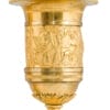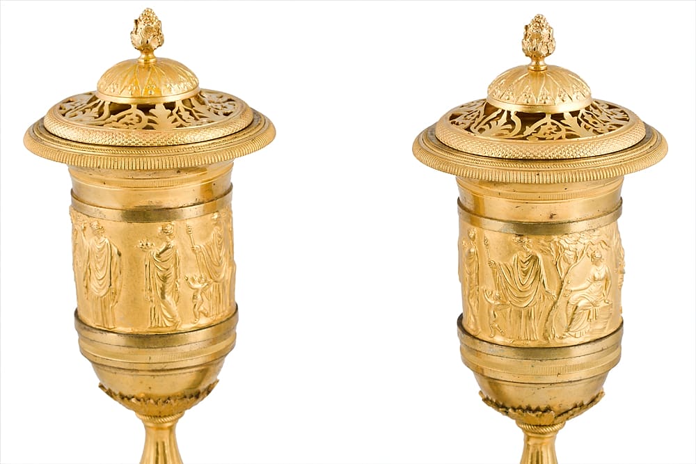 Ogni bruciaprofumo presenta un corpo finemente cesellato con motivi classici ispirati all’antichità greco-romana, raffiguranti figure drappeggiate in rilievo. I coperchi, arricchiti da prese a forma di fiore, completano l’eleganza dell’insieme. Il basamento in marmo, decorato con mascheroni in bronzo, conferisce solidità e prestigio all’opera.