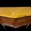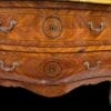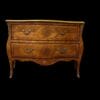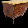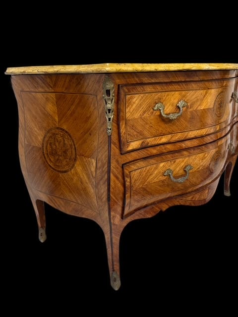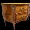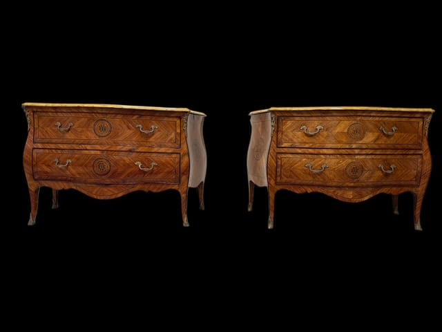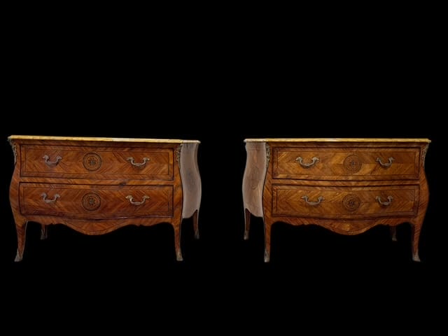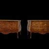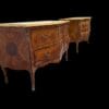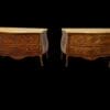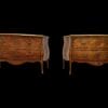 Coppia di cassettoni lastronati in ” Bois de Rose” e legni pregiati, di forma bombata con montature e scarpette in bronzo dorato. Piani in marmo giallo fossile.