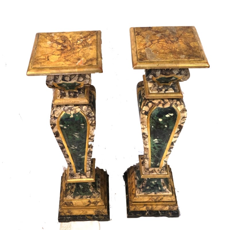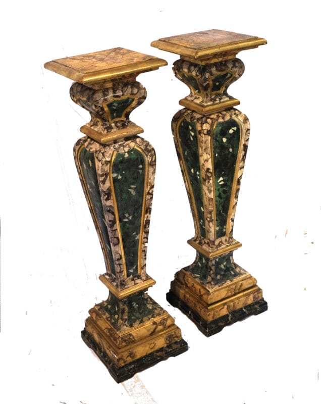 Coppia di colonne portabusto in legno dolce dorato e laccato a finto marmo. Emilia, epoca seconda metà del XIX secolo. Buono lo stato di conservazione. Alcune abrasioni presenti soprattutto in uno dei due piani delle colonne (come da foto).