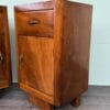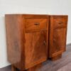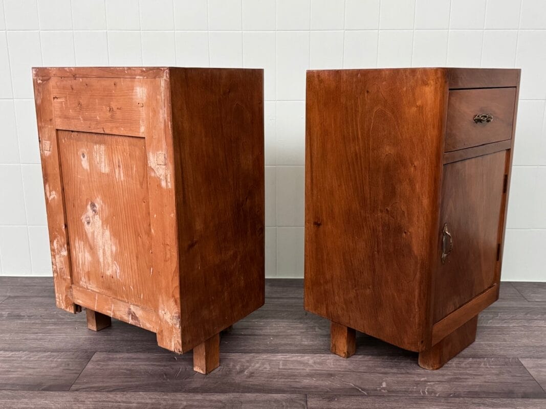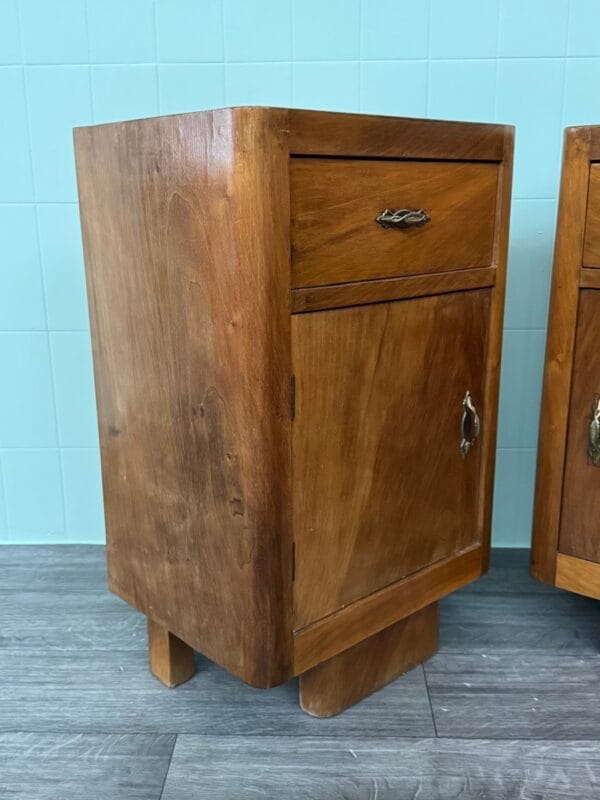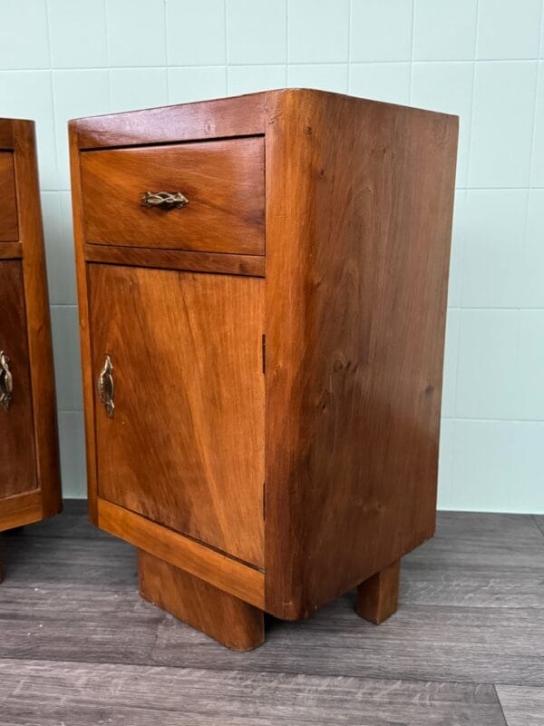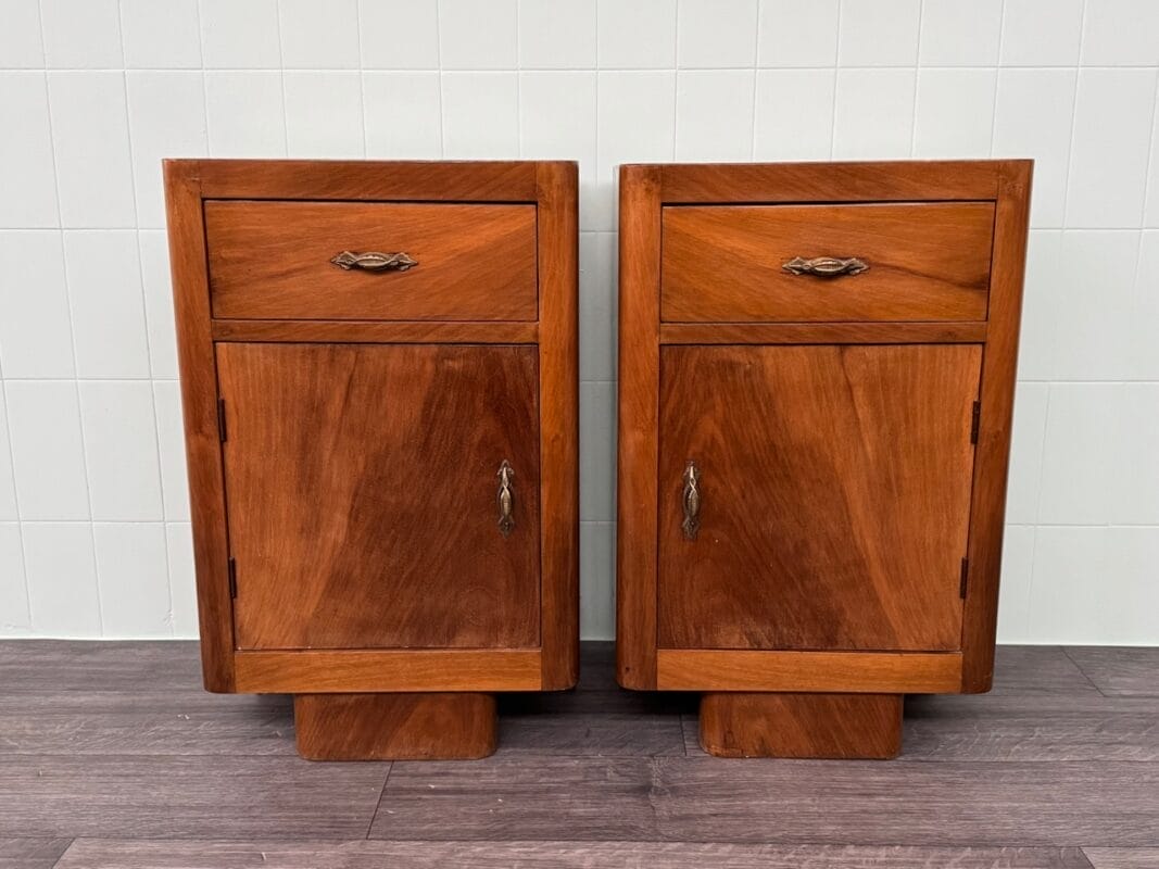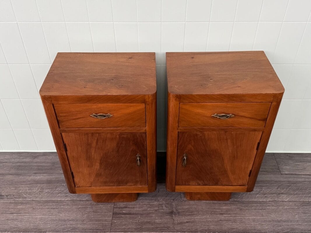 I comodini presentano un design chiaramente ispirato all’Art Déco, riconoscibile dalle linee arrotondate, dalla simmetria e dalla finitura lucida.