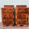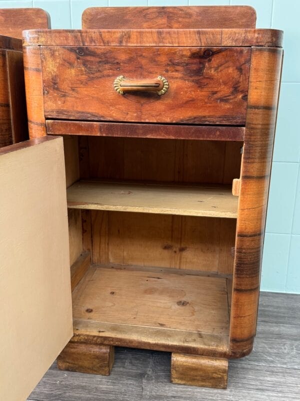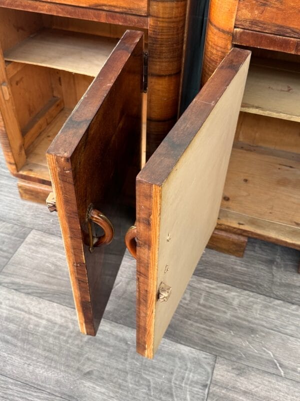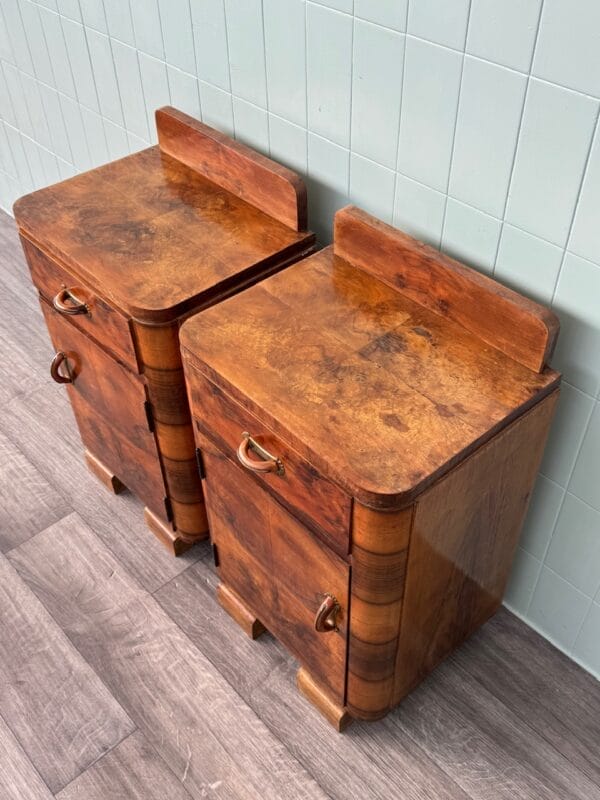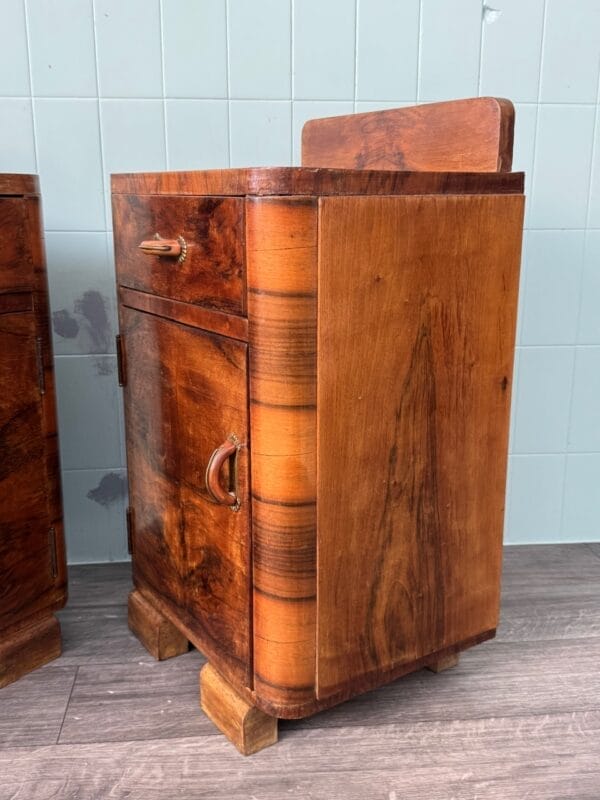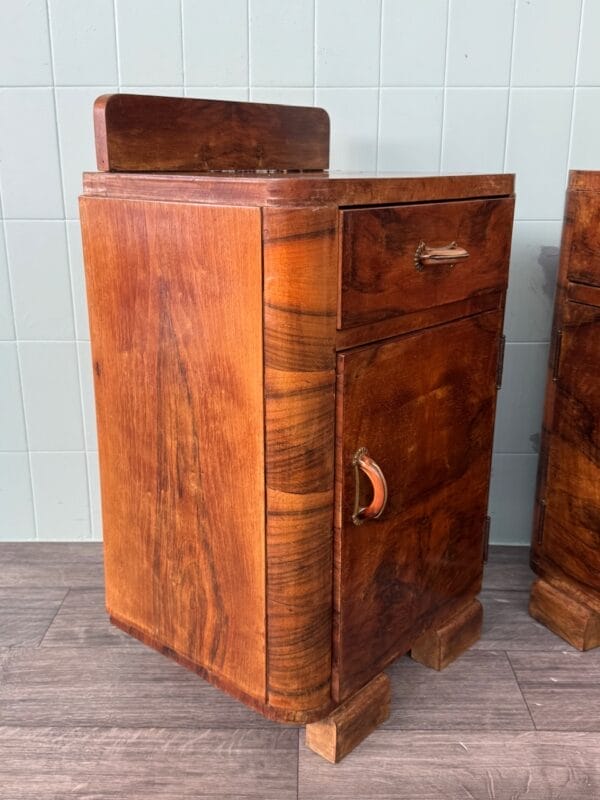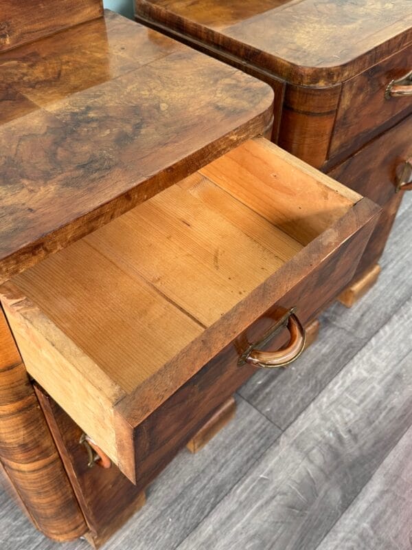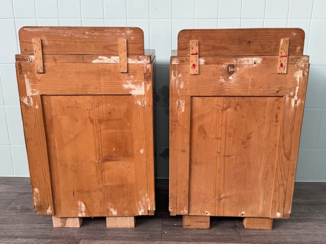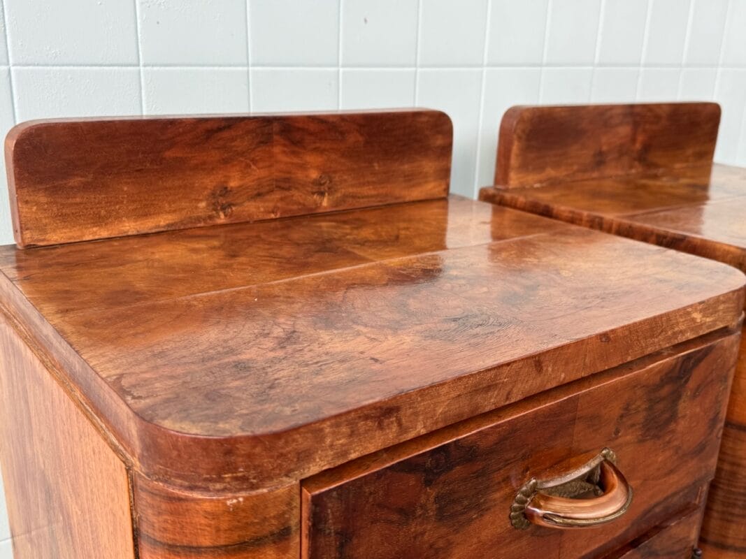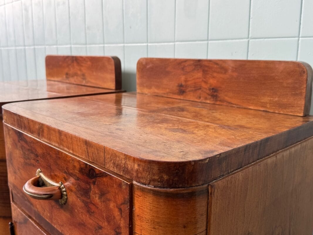 I comodini presentano un design chiaramente ispirato all’Art Déco, riconoscibile dalle linee arrotondate, dalla simmetria e dalla finitura lucida.
