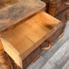 Ogni comodino ha un cassetto singolo con maniglia in bachelite ed ottone che aggiunge un tocco classico.