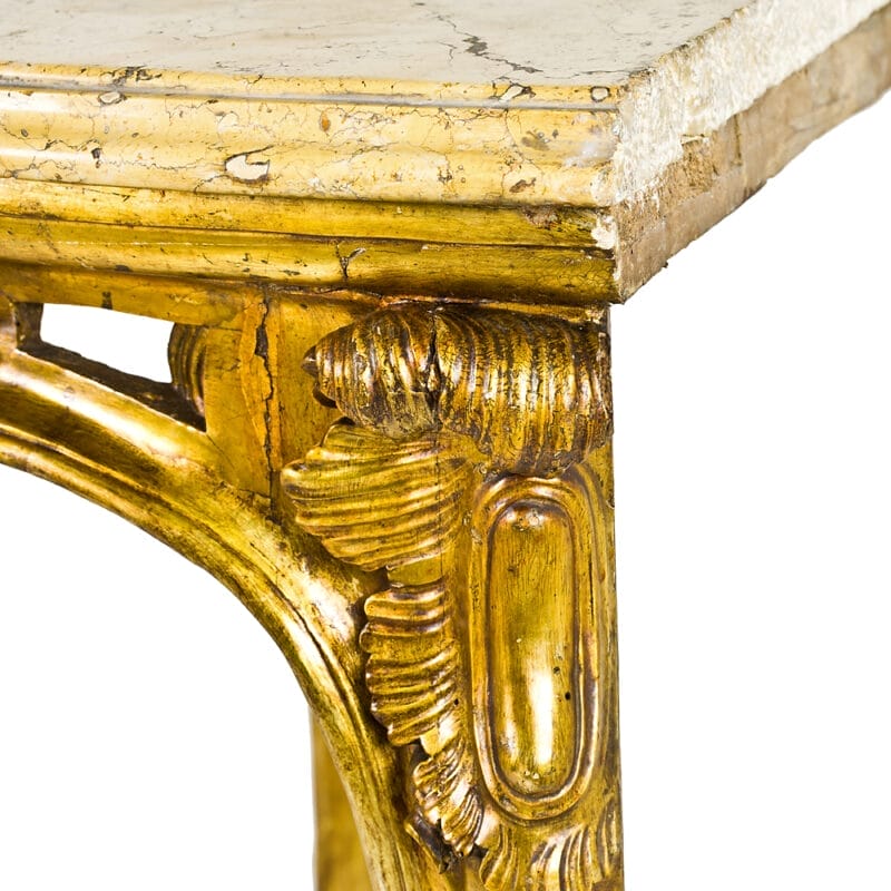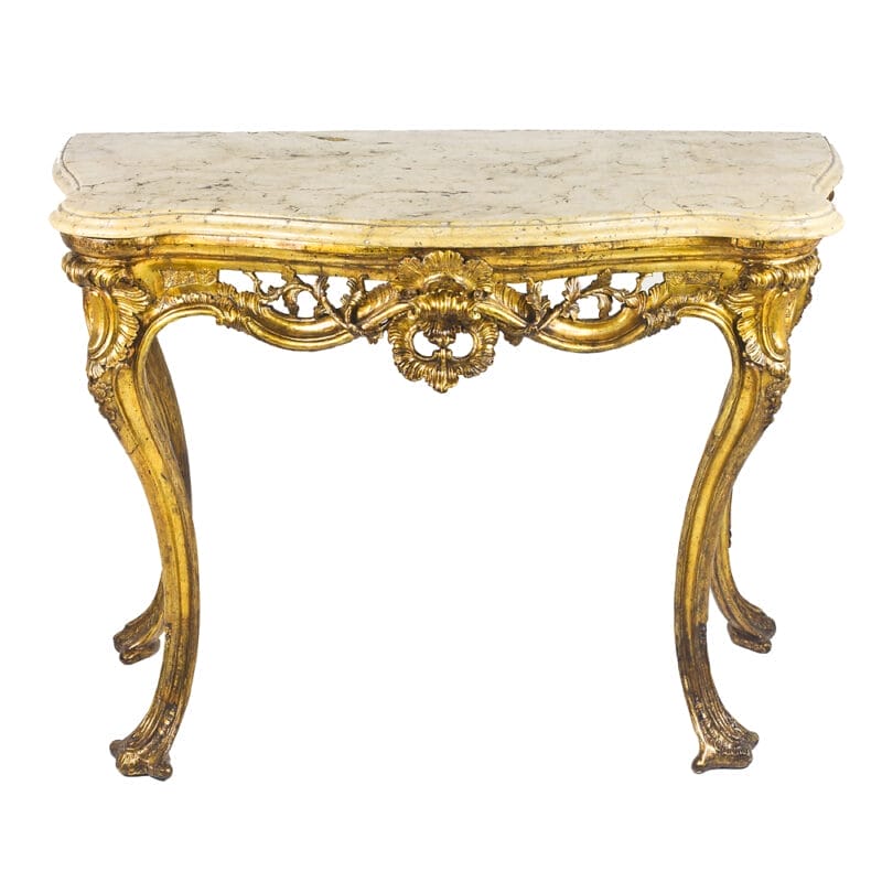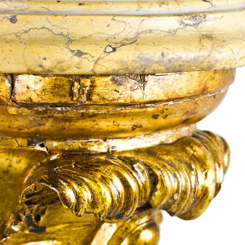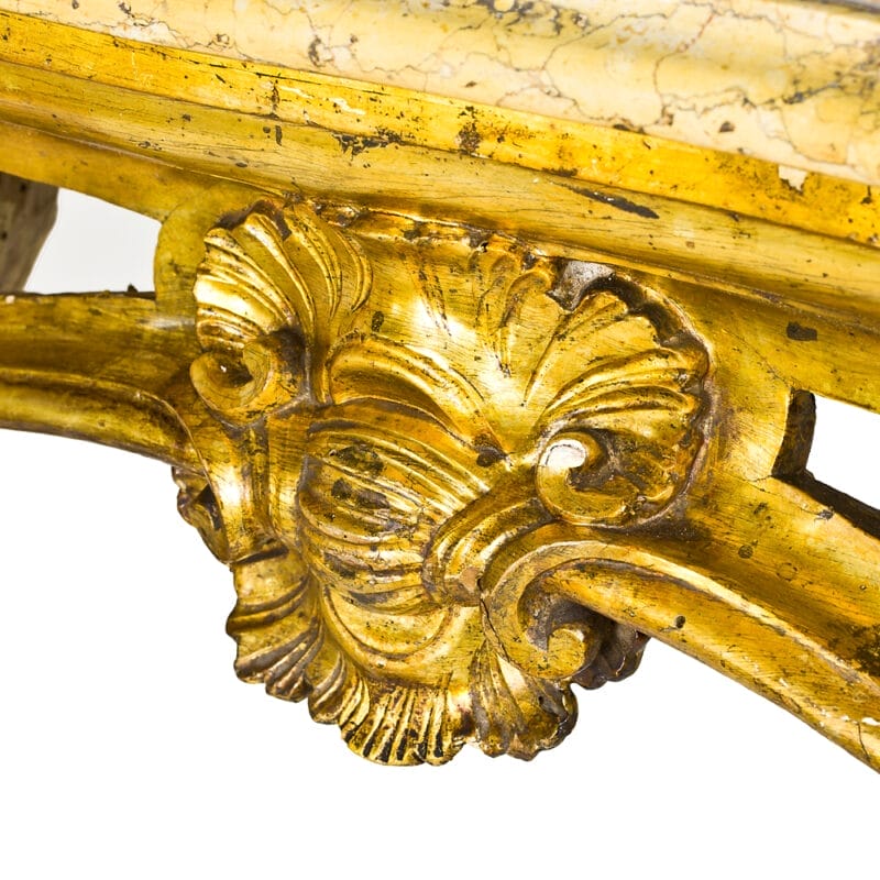 Importantissima Coppia di Consolle Luigi XV Napoli, finemente realizzate in legno intagliato e dorato. Piani in marmo giallo di Siena. Di epoca della prima metà del Settecento.