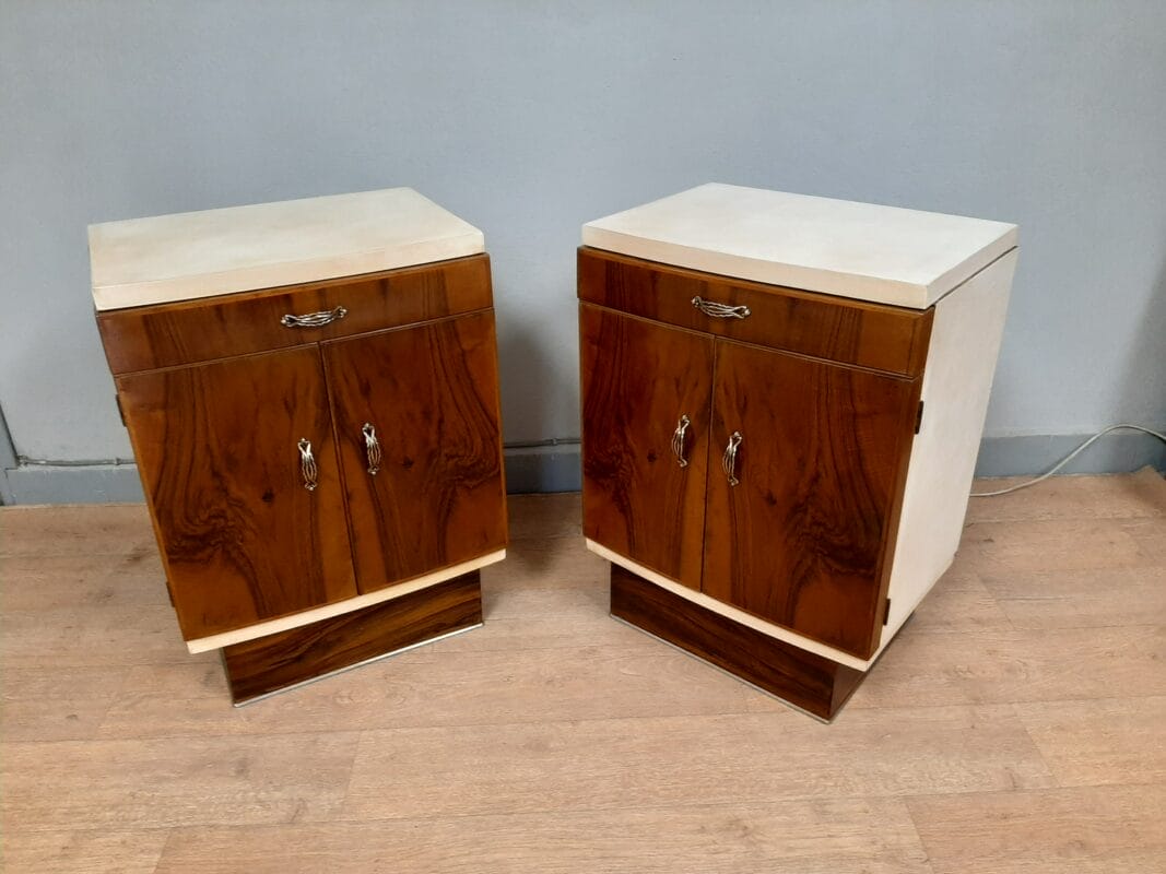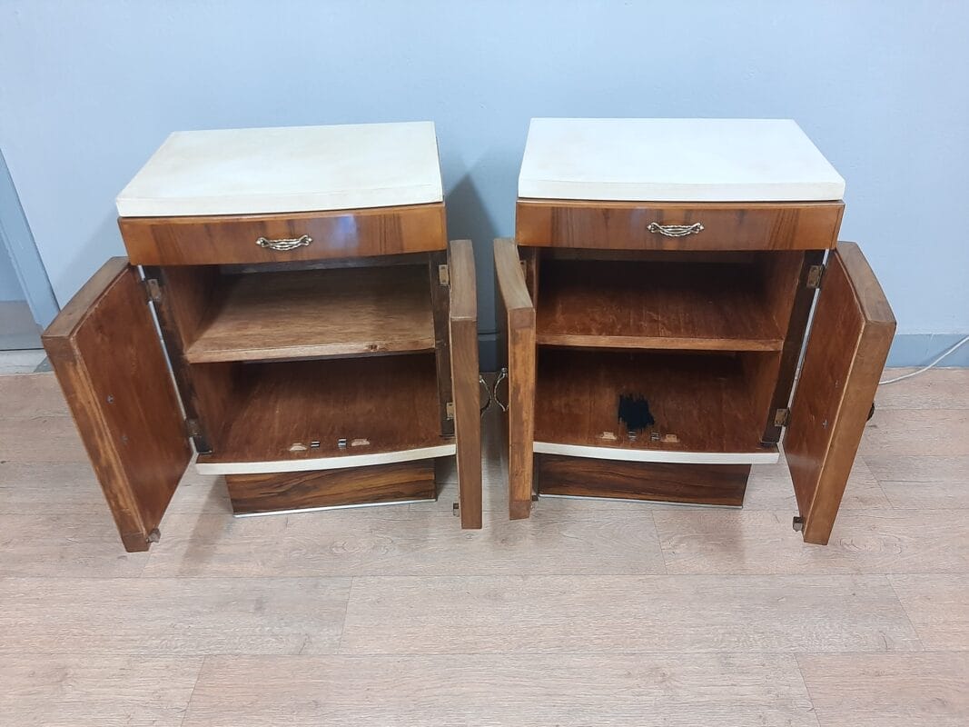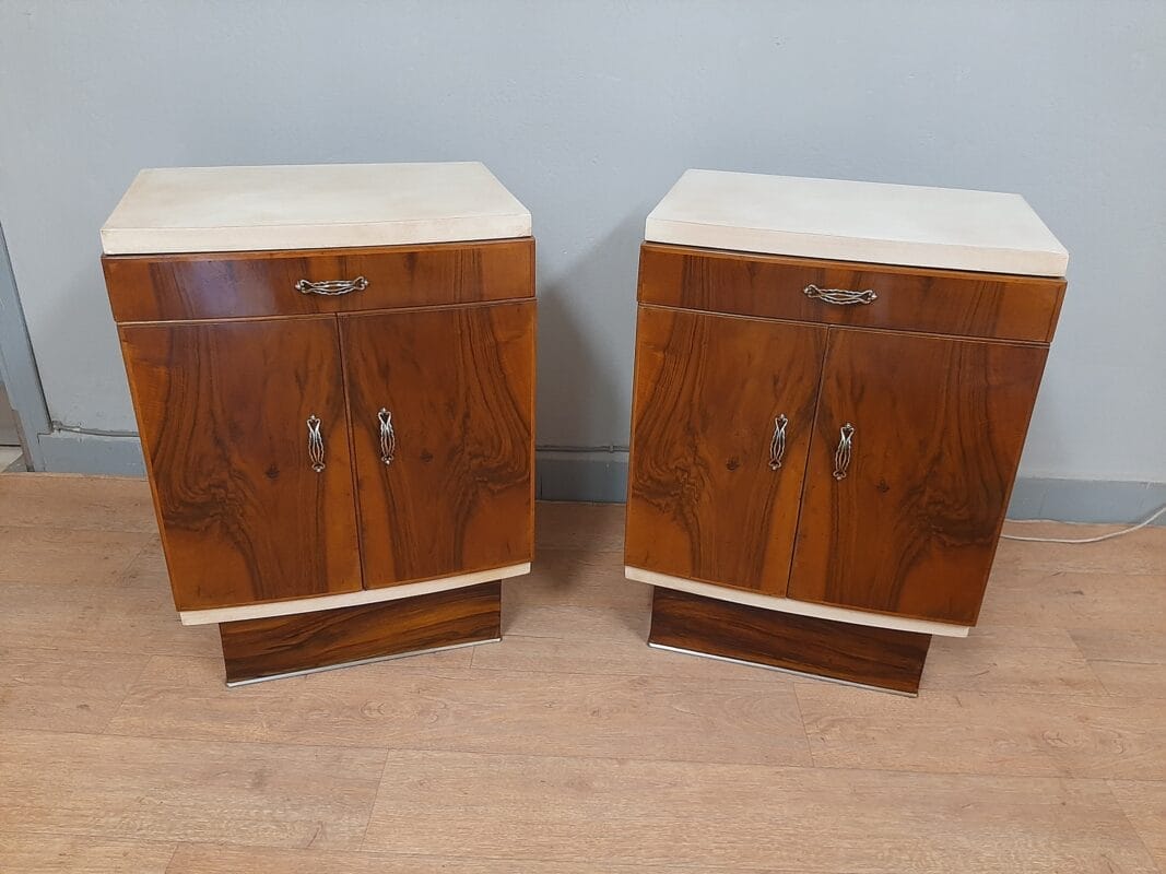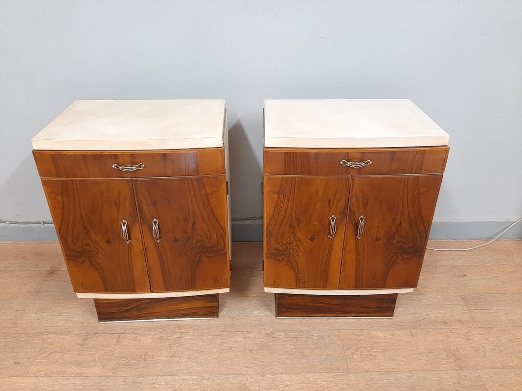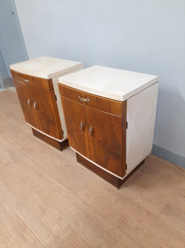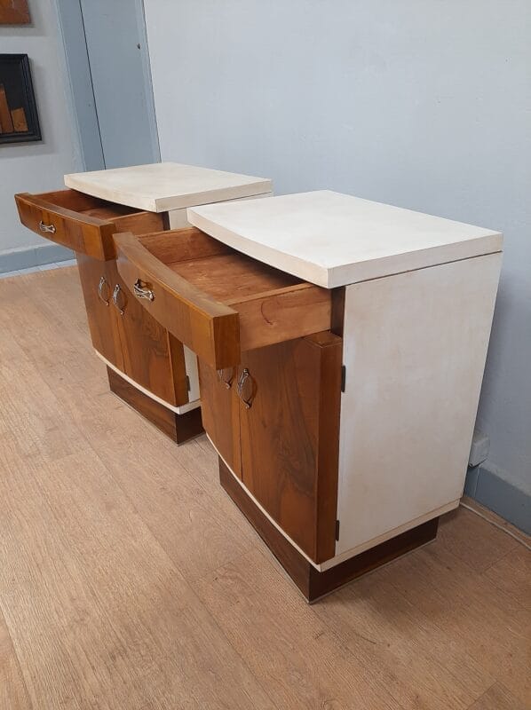 Coppia di grandi comodini art deco da camera degli anni 1930-40 , impiallacciati in noce bionda e pergamena, presentano 2 sportelli e un cassetto sul fronte. Completamente originali comprese le maniglie sono stati restaurati in maniera professionale conservativa e lucidati a gommalacca. Sono pronti per essere utilizzati da subito. Dimensioni: cm 52-36-70 h