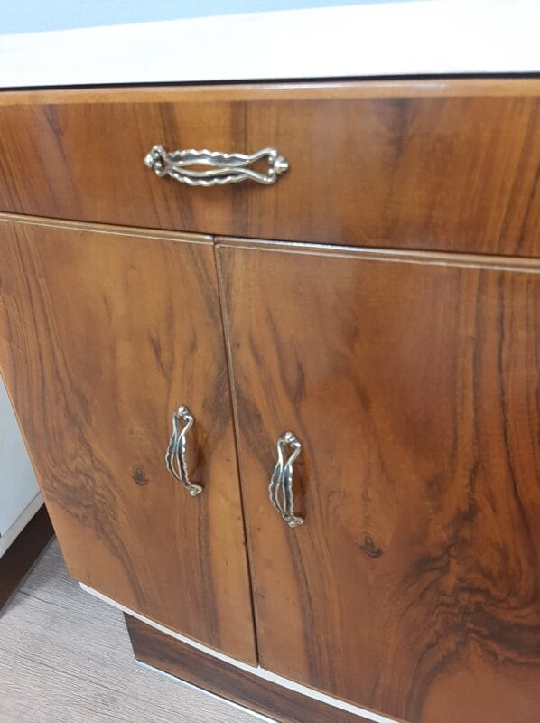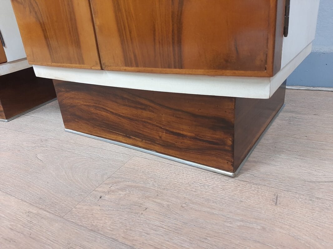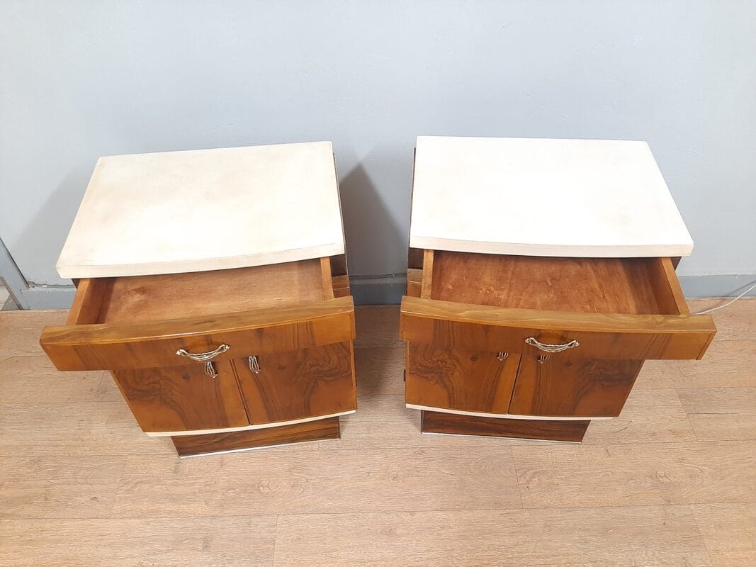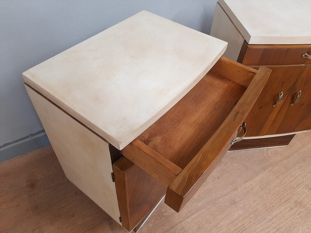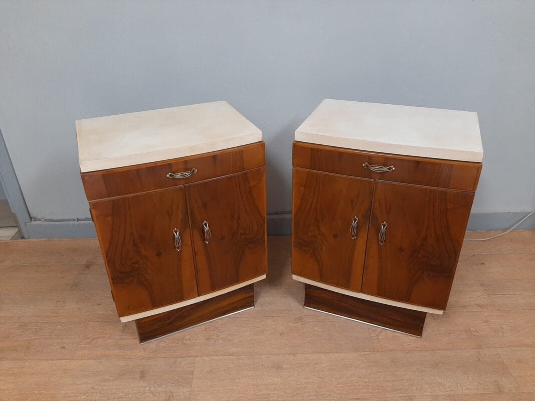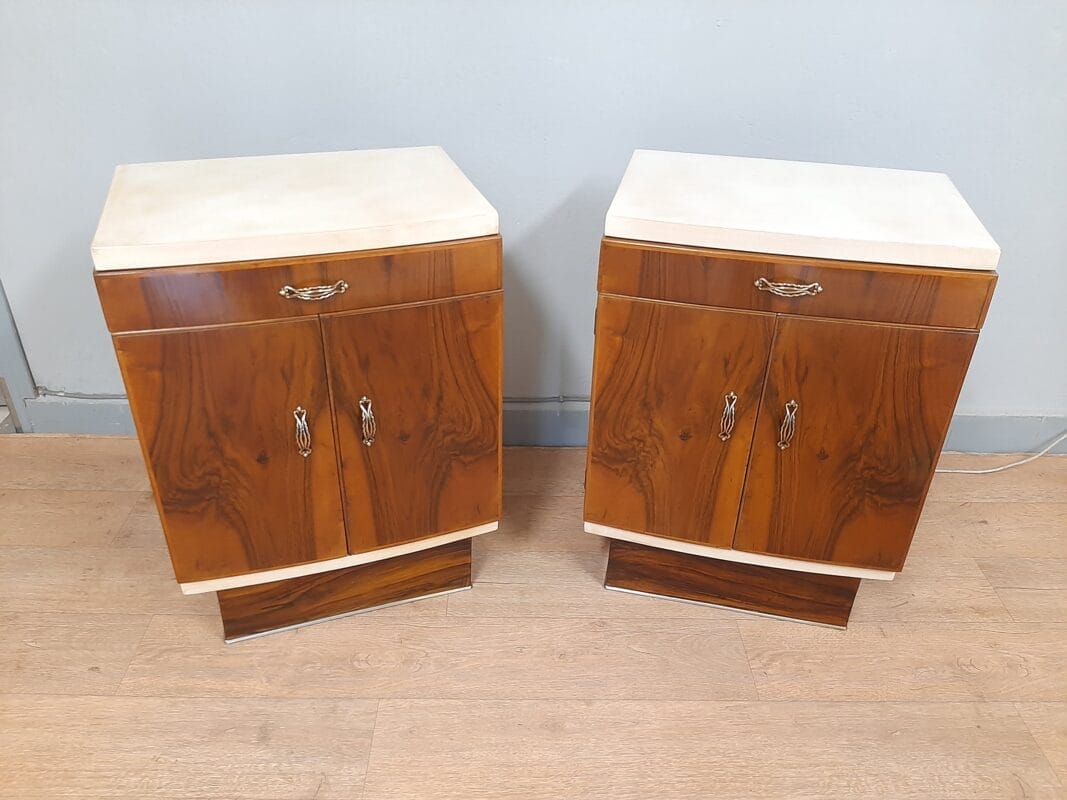 Coppia di grandi comodini art deco da camera degli anni 1930-40 , impiallacciati in noce bionda e pergamena, presentano 2 sportelli e un cassetto sul fronte. Completamente originali comprese le maniglie sono stati restaurati in maniera professionale conservativa e lucidati a gommalacca. Sono pronti per essere utilizzati da subito. Dimensioni: cm 52-36-70 h