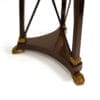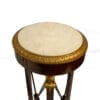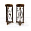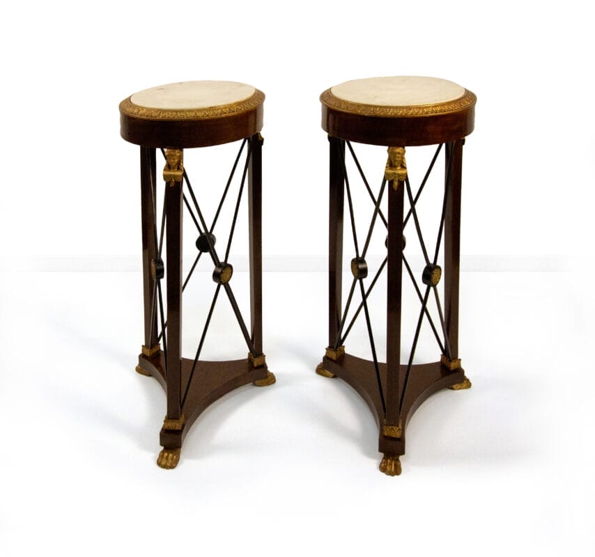 Coppia di gueridon in mogano, di gusto Impero, inizio XX secolo, piano circolare in marmo bianco con ciglio dorato a palmette su cintura diritta; montanti quadrangolari con attacco ad erma muliebre dorata, sottili traverse a X centrate da rosetta e piano di base su piedi a zampa leonina, cm 103×43