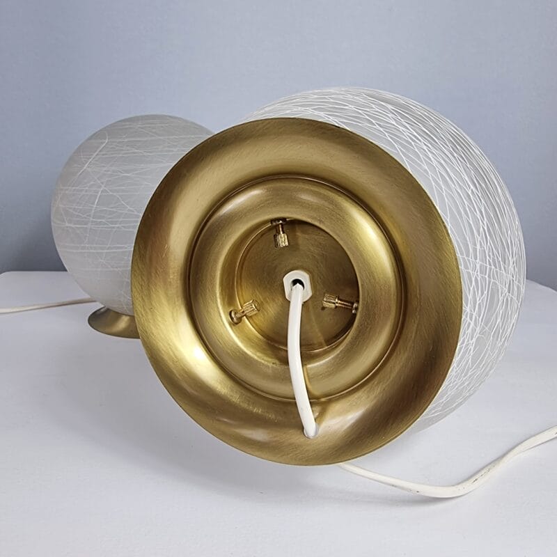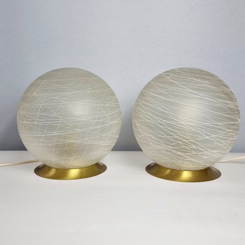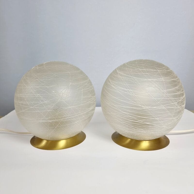 Due piccole sfere in vetro di Murano, una lavorazione molto particolare, fili in vetro bianco che si intrecciano tra loro e una semplice base in ottone , eppure di grande fascino , le lampade sono in eccellenti condizioni originali e perfettamente funzionanti