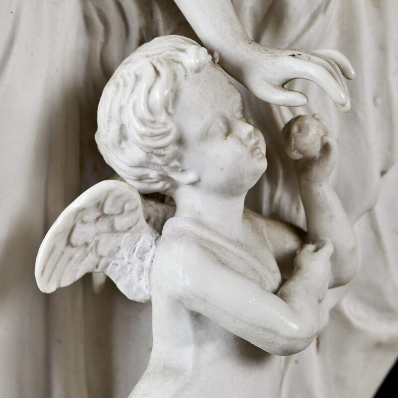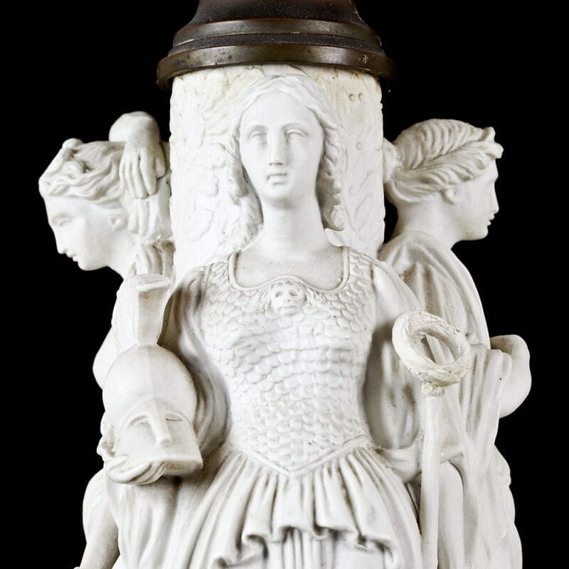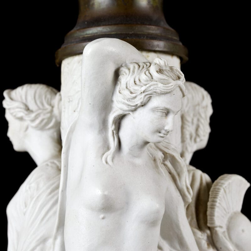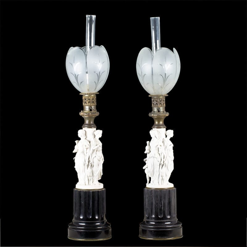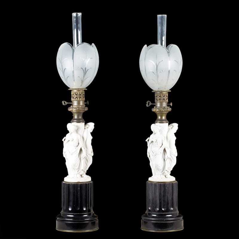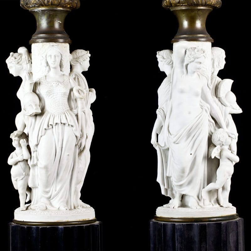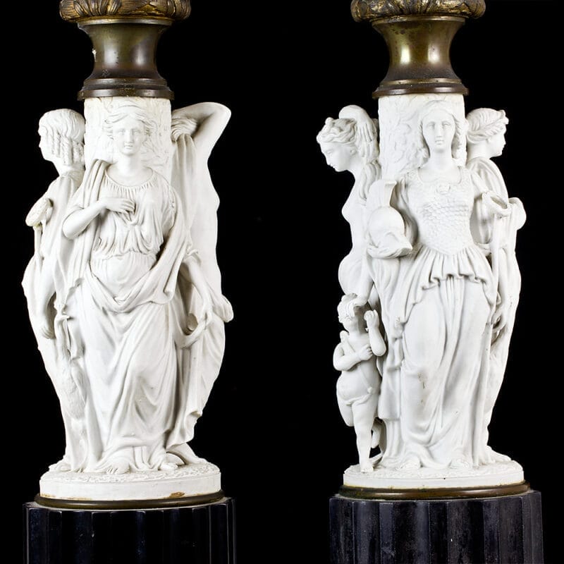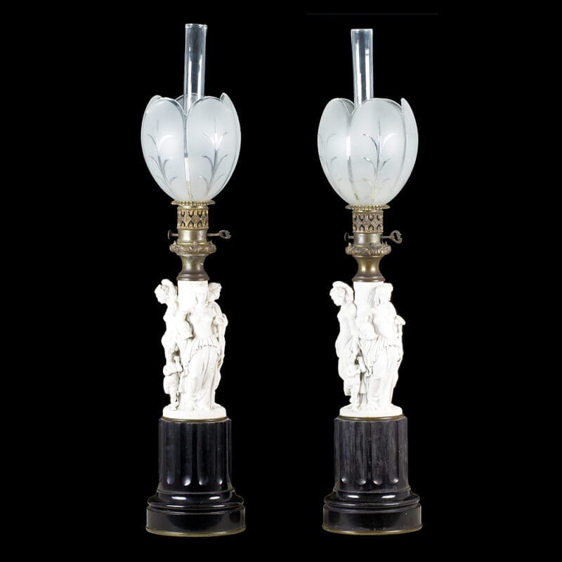 Elegante coppia di lumi ad olio risalenti alla metà dell’Ottocento, realizzati con basi in marmo nero del Belgio a forma di colonna scanalata, su cui si ergono figure allegoriche in porcellana bianca biscuit, modellate con finezza in stile neoclassico. Le sculture raffigurano personaggi femminili avvolti in panneggi classici e ornati da attributi simbolici.