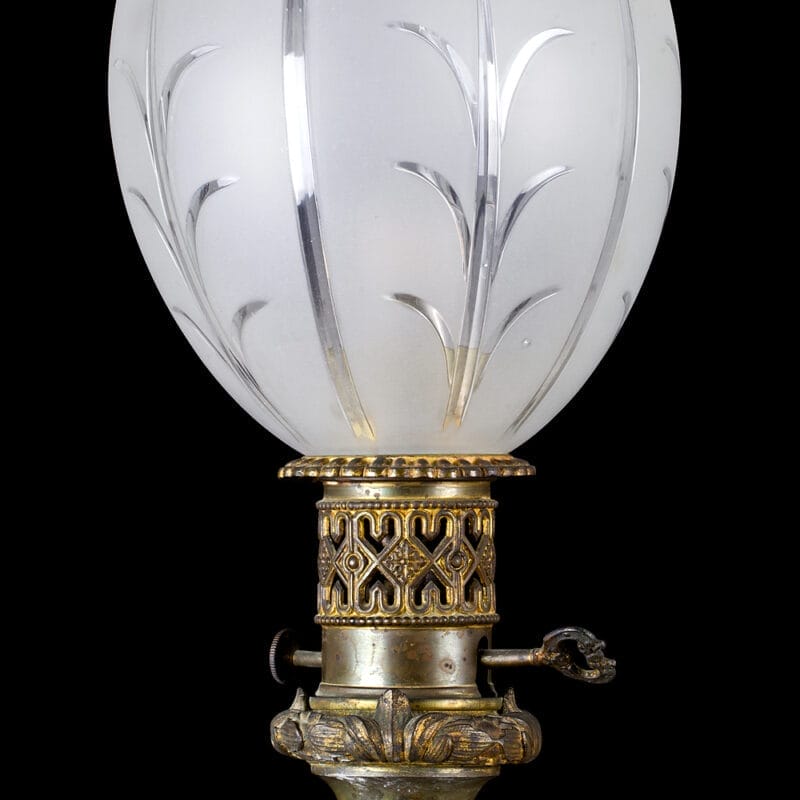 La parte superiore presenta il serbatoio in ottone finemente lavorato e l’elegante campana in vetro soffiato satinato, decorata a incisione con motivi fogliacei stilizzati. L’insieme unisce armoniosamente materiali preziosi e lavorazioni di pregio, risultando non solo funzionale, ma anche di grande valore decorativo.