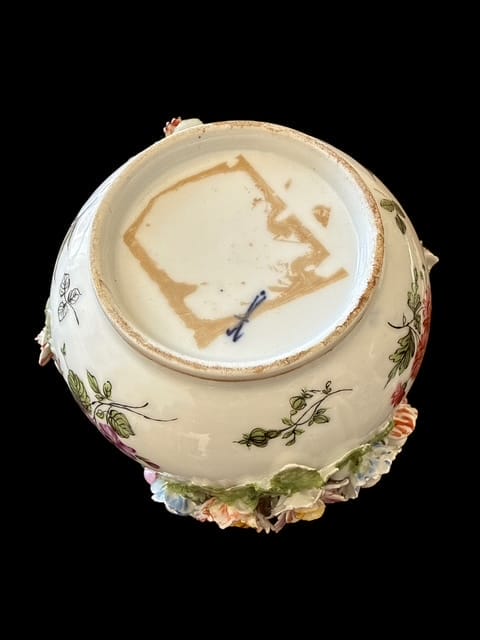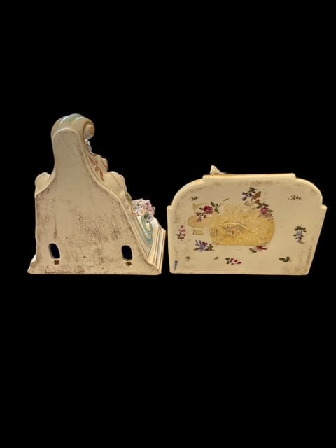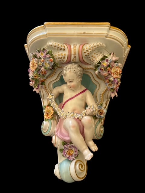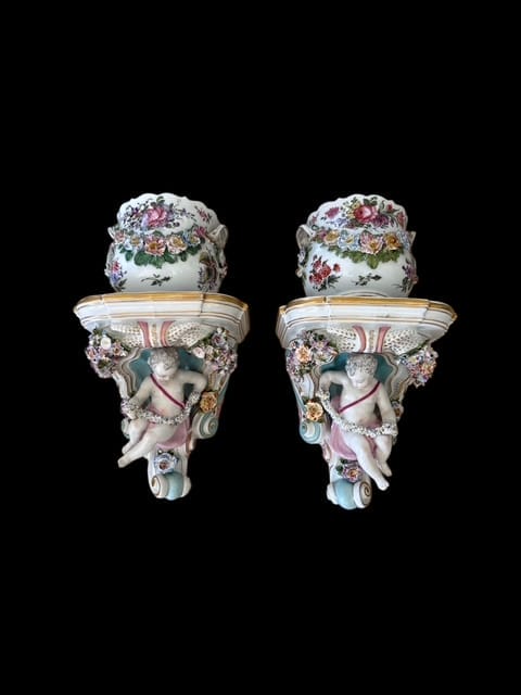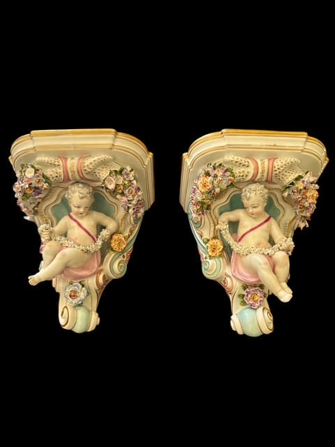 Coppia di mensole in porcellana policroma con putti e decorazioni floreali con coppia di vasi ” en pendant” Marchio di fabbrica sotto la base del vaso e sopra il piano della mensola.