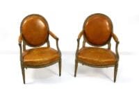 Grazioso set di 2 poltrone primi decenni secolo XX. Queste poltrone sono in stile Luigi XVI in legno laccato con raffinate decorazioni dorate. Rivestite in similpelle verde. Questa bella coppia di poltrone ha una forma molto lineare e una seduta confortevole. Si segnala segni di usura nella laccatura e fori da tarlo. Proposta ad un’ottimo prezzo comunque trattabile vi invitiamo ad inviarci le vostre proposte di acquisto le valuteremo con piacere.