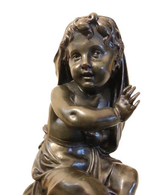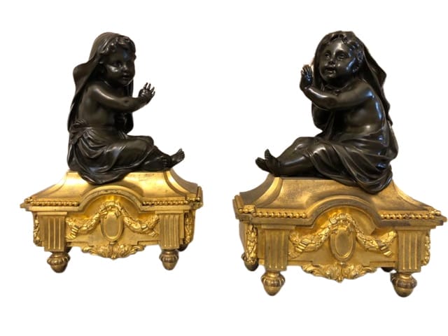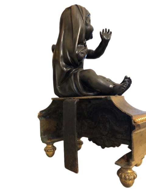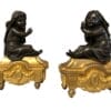 COPPIA DI SCULTURE RAFFIGURANTI PUTTI SEDUTI, IN BRONZO FINEMENTE CESELLATO E PATINATO SU BASI DORATI.