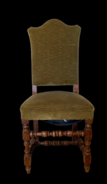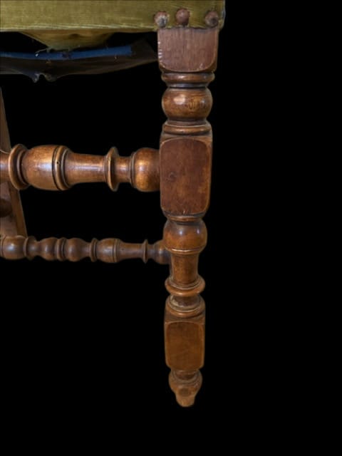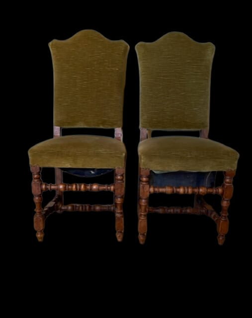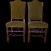 COPPIA DI SEDIE IN NOCE FINEMENTE INTAGLIATE TAPPEZZATE IN VELLUTO VERDE.