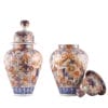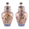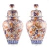 Elegante coppia di Vasi giapponesi Imari con coperchio, risalenti al XIX secolo (periodo Edo tardivo o Meiji). Realizzati in porcellana smaltata, presentano una forma bombata con coperchio a cupola sormontato da un pomolo a bulbo.