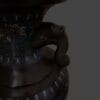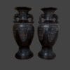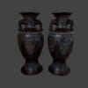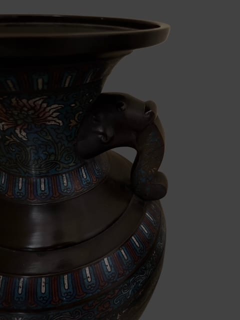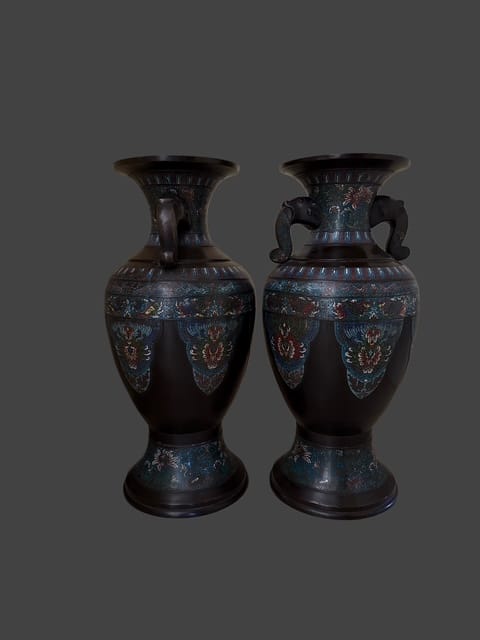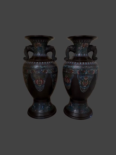 Coppia di vasi in bronzo brunito e smaltato con decorazioni policrome di gusto orientale. Manici a forma di testa di elefante.