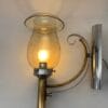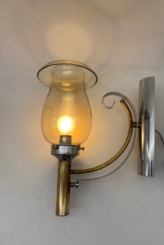 Si tratta di due applique da parete in stile vintage con struttura in metallo cromato, ottone e ferro. I diffusori in vetro soffiato color ambra fumè sono stati fatti a mano a Murano; ogni lampada è composta da una base verticale in metallo cromato fissata al muro dalla quale parte un braccio curvo in ottone con una piccola voluta decorativa che sostiene il portalampada cilindrico in ottone, sul quale è montato un vetro a forma di coppa svasata con bordo leggermente scurito; il vetro ha una sagoma morbida, bombata nella parte inferiore e più aperta verso l’alto, creando un effetto di lanterna elegante; la lampada accesa mostra una luce calda diffusa attraverso il vetro ambrato. I materiali mostrano una patina del tempo, con l’ottone leggermente ossidato e il vetro perfettamente integro; lo stile complessivo richiama elementi déco e classici reinterpretati in chiave più moderna, con una combinazione armoniosa di curve, metallo e vetro caldo.