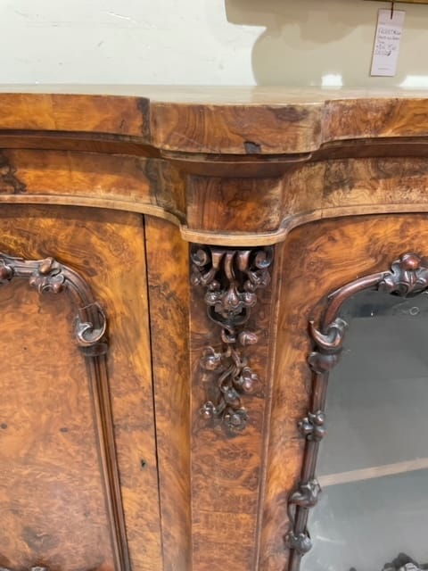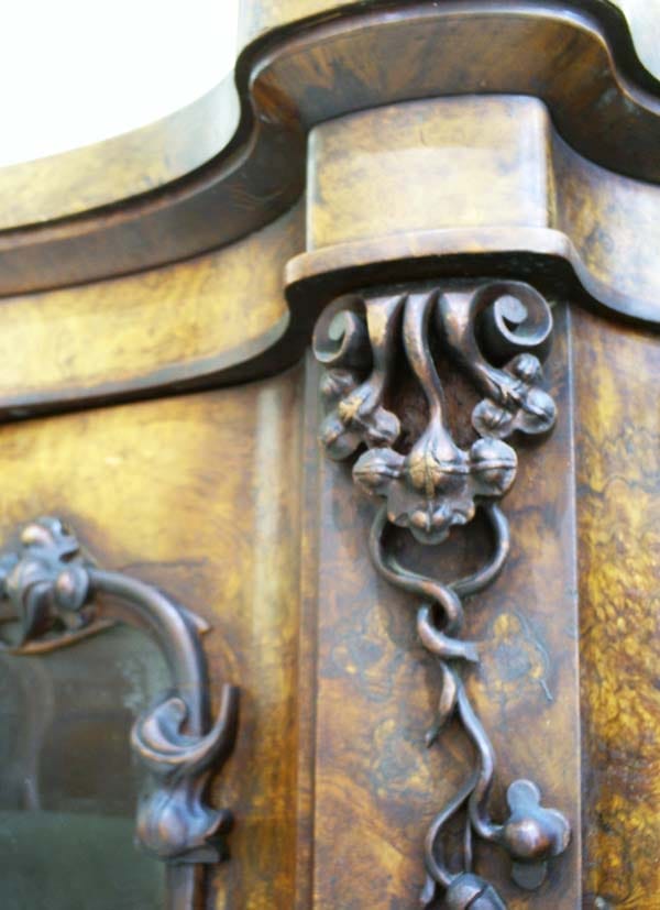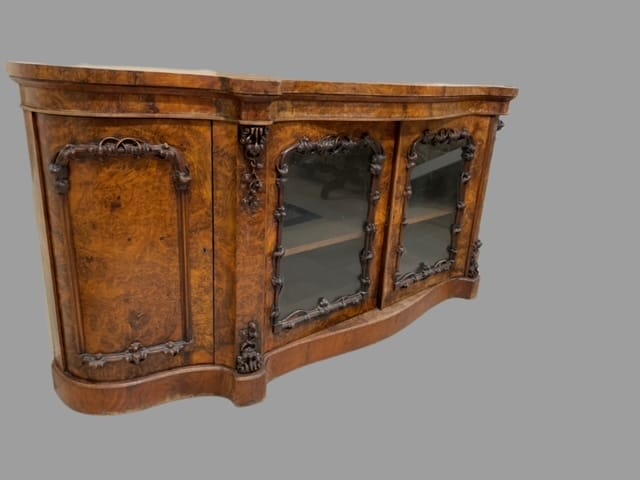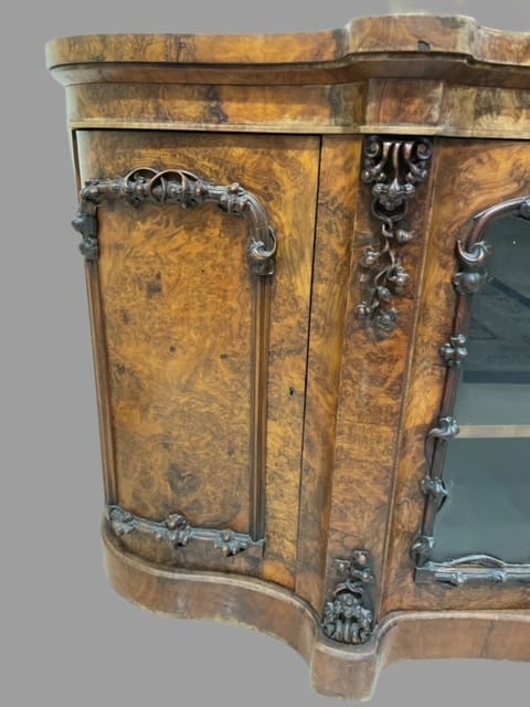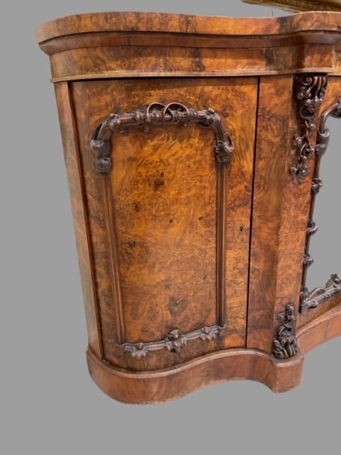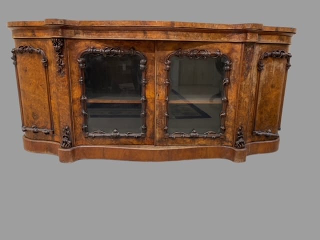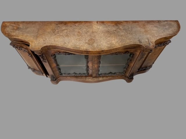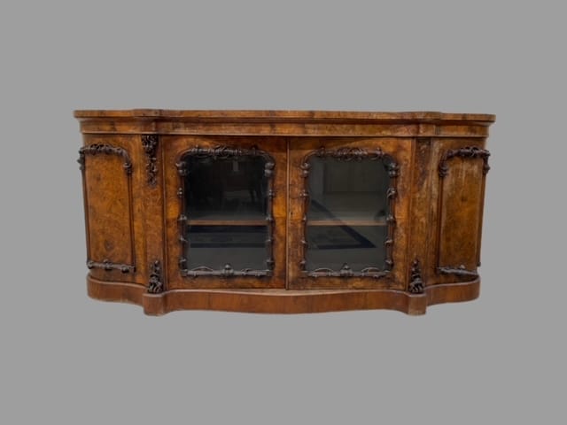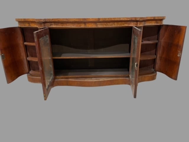 Credenza in radica di noce con profilo mosso, intagli a motivi di tralci stilizzati incorniciano le quattro ante.