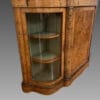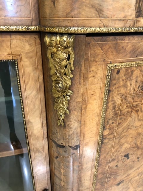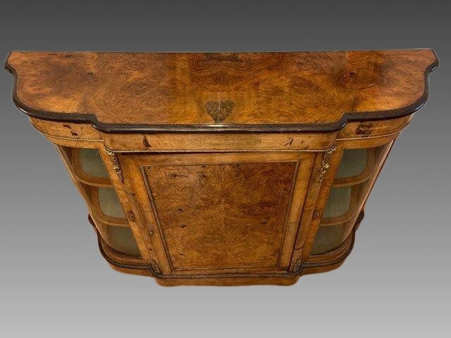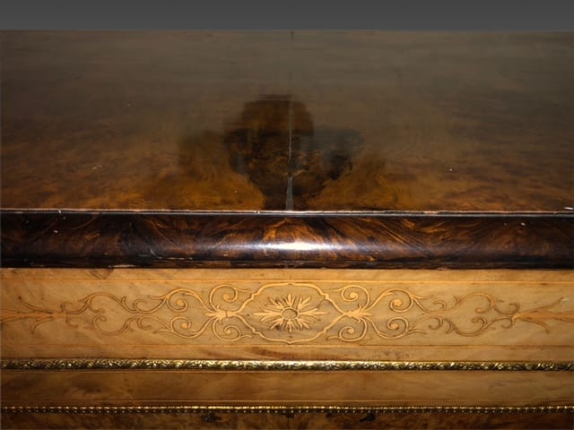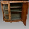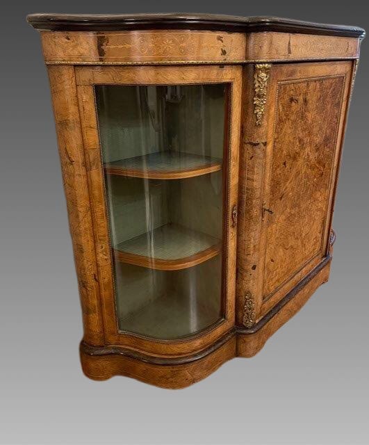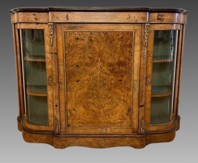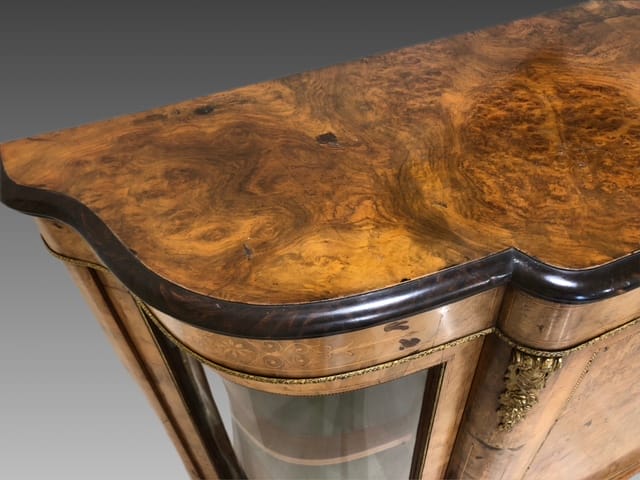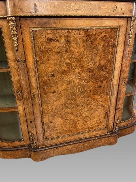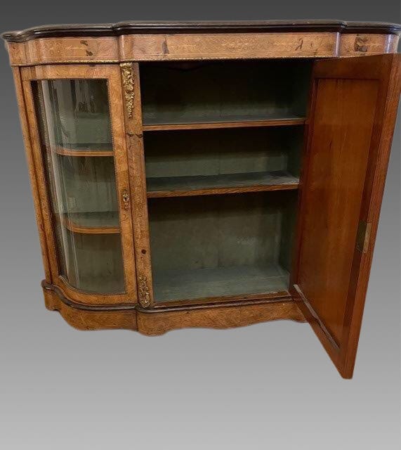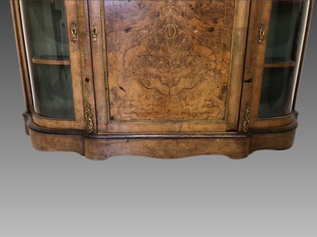 CREDENZA IN NOCE E RADICA DI NOCE CON INTARSI IN LEGNO CHIARO. ANTA CENTRALE INTARSIATA E DUE ANTE LATERALI CON VETRI CURVI.