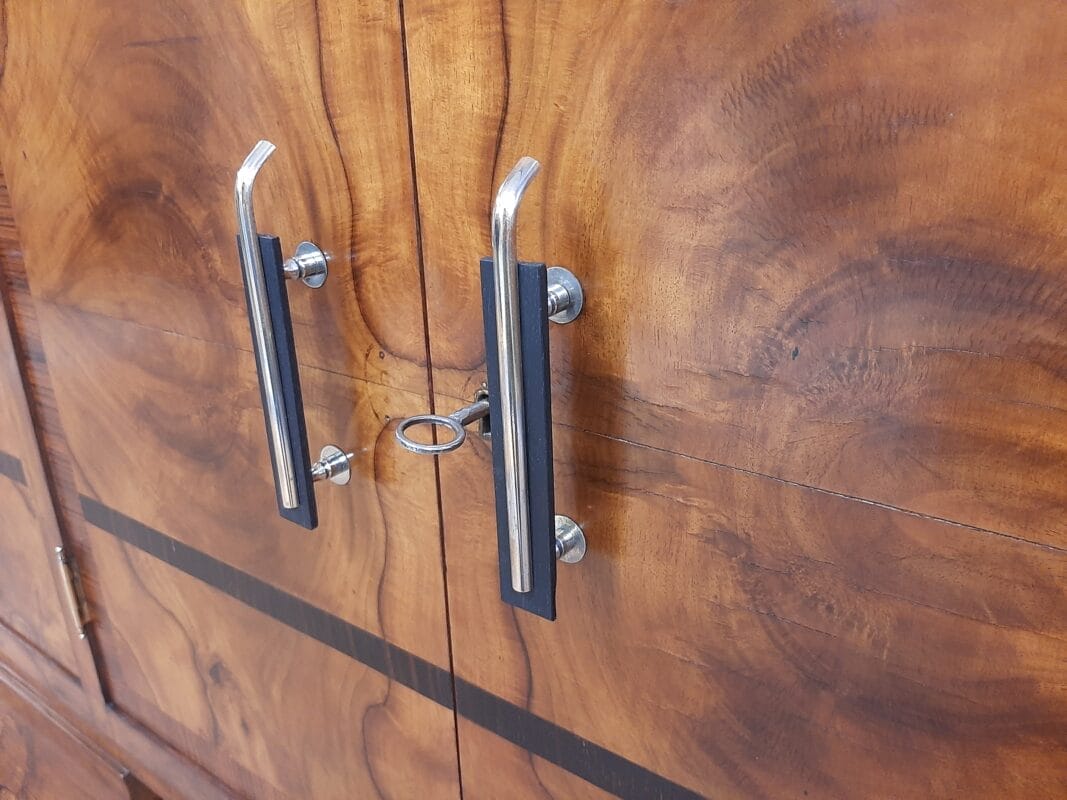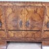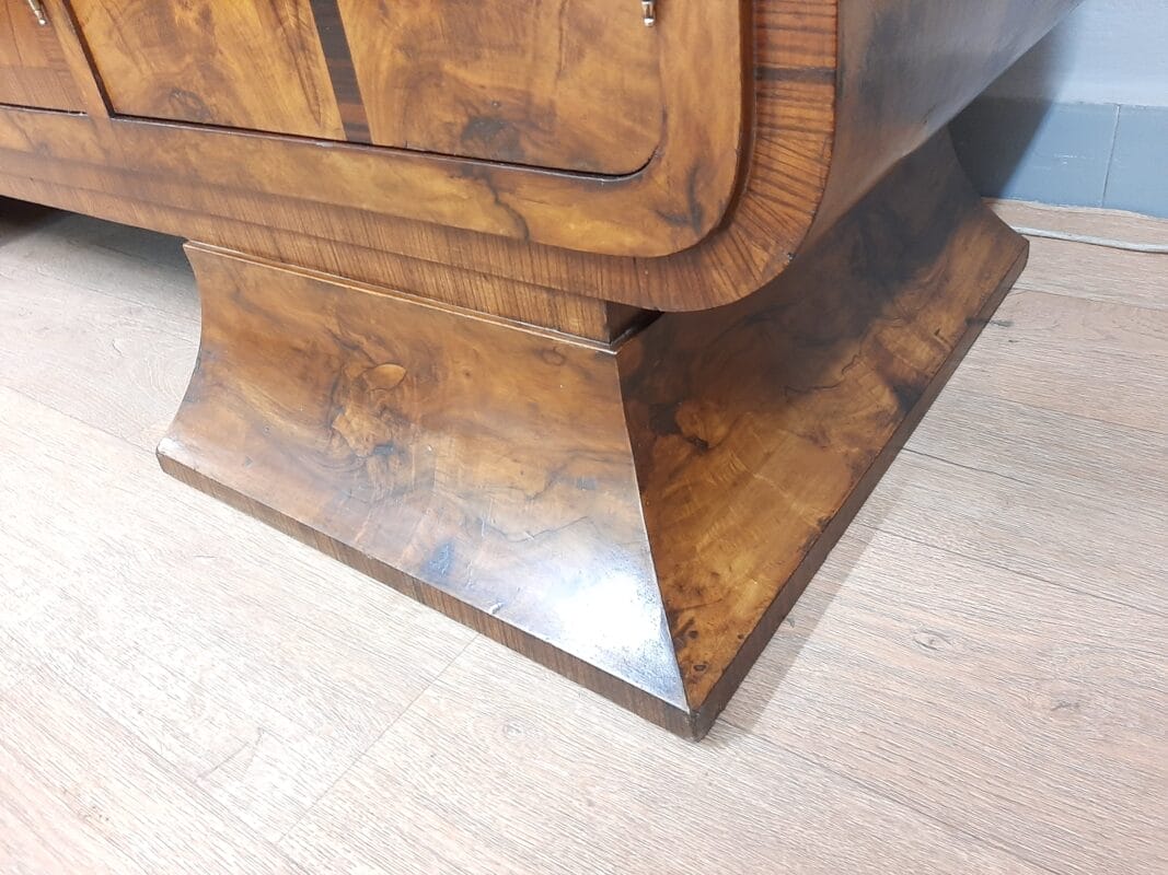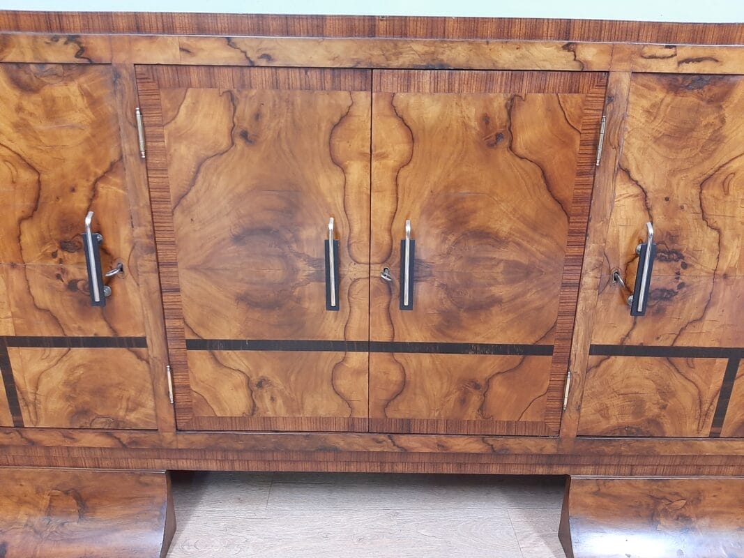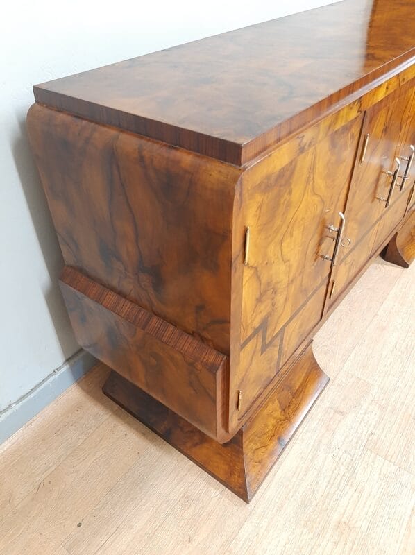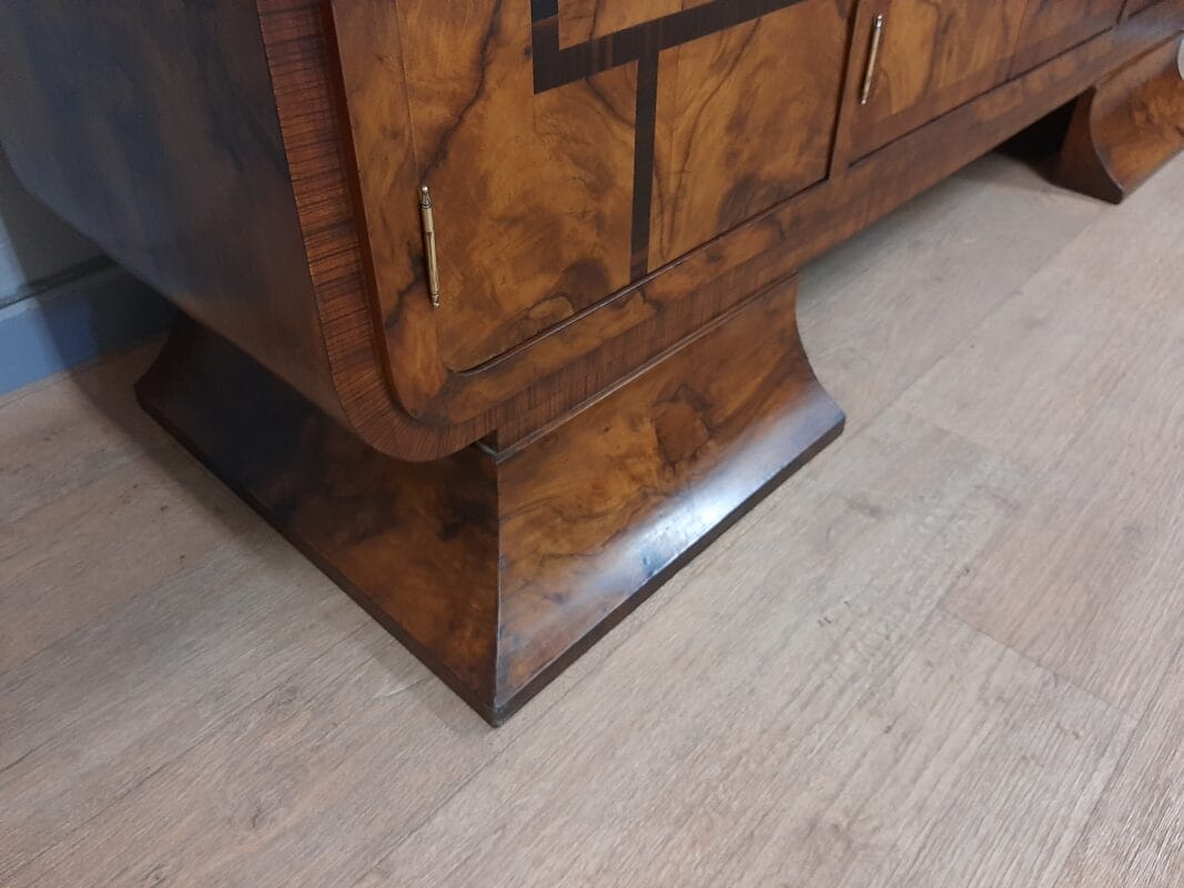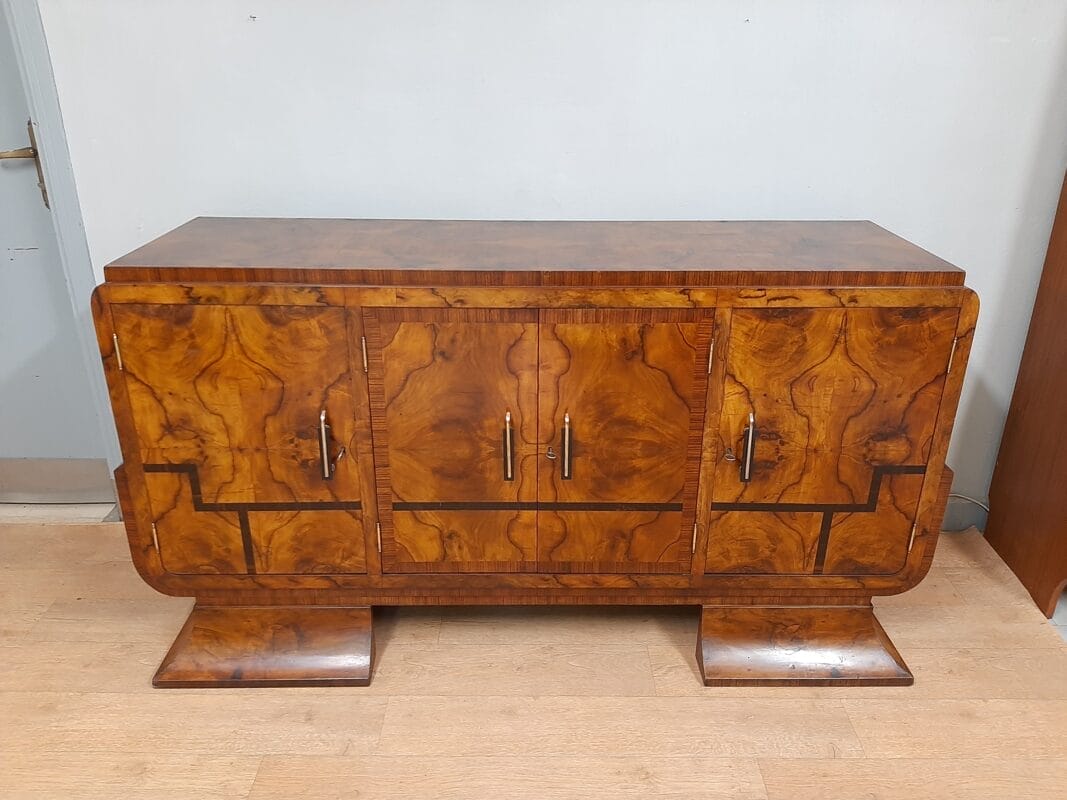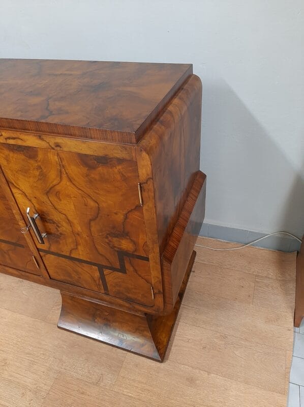 Bellissima credenza art deco degli anni 1930-40 dalle dimensioni contenute completamente rivestita in radica di noce bionda con inserti in palissandro, completamente originale comprese le belle maniglie, è stata restaurata in maniera professionale conservativa e lucidata a gommalacca, ora è pronta per essere inserito da subito.