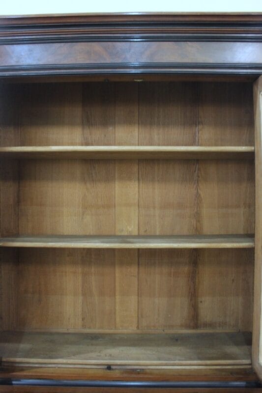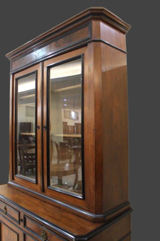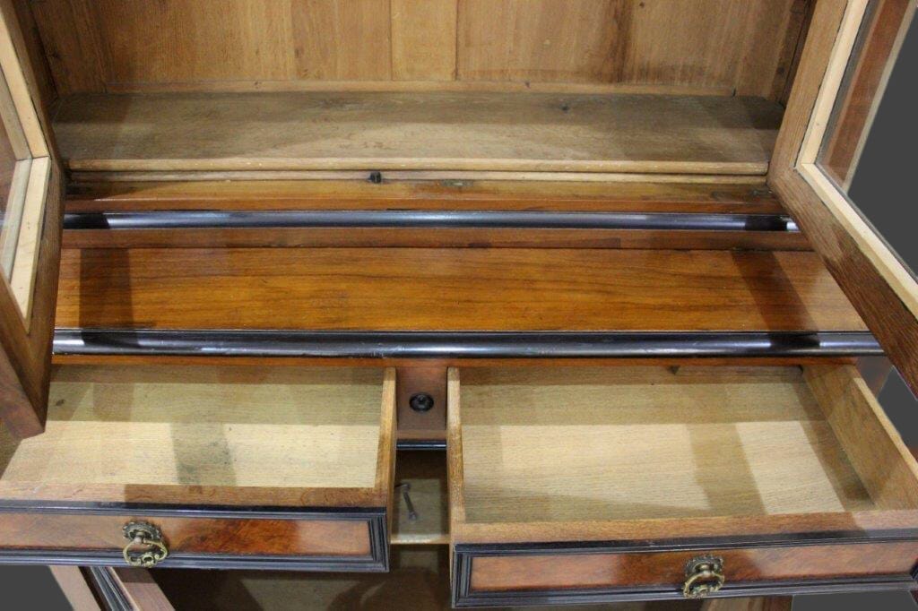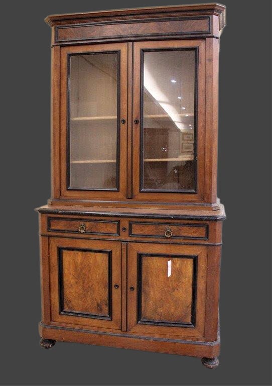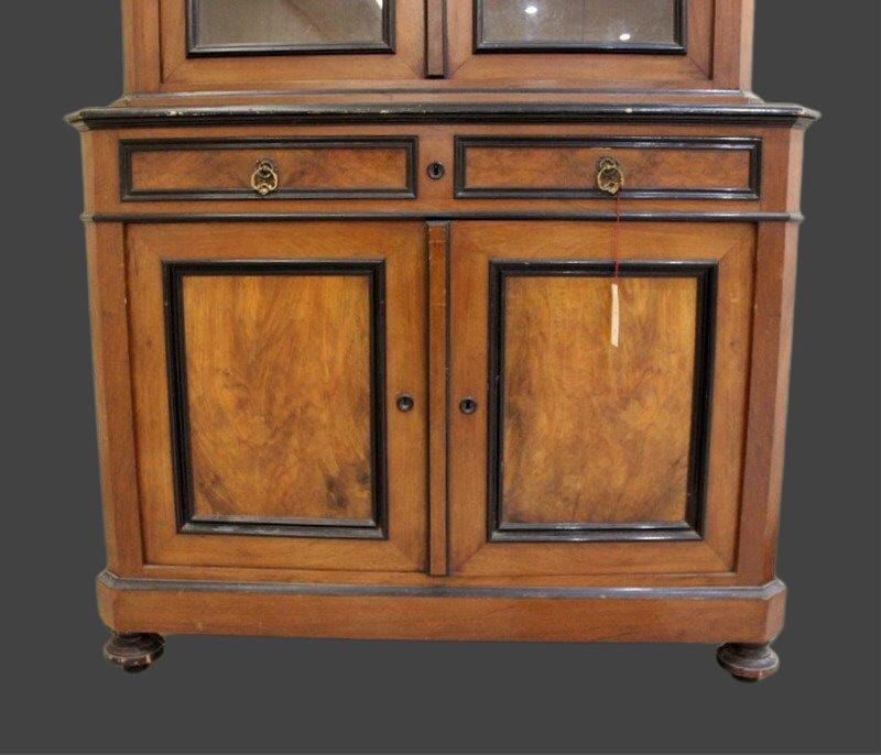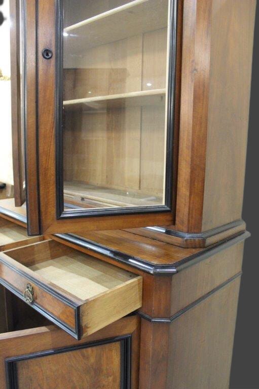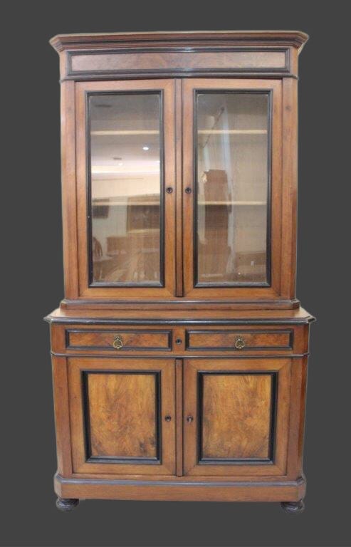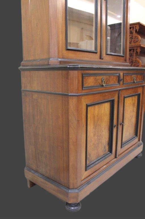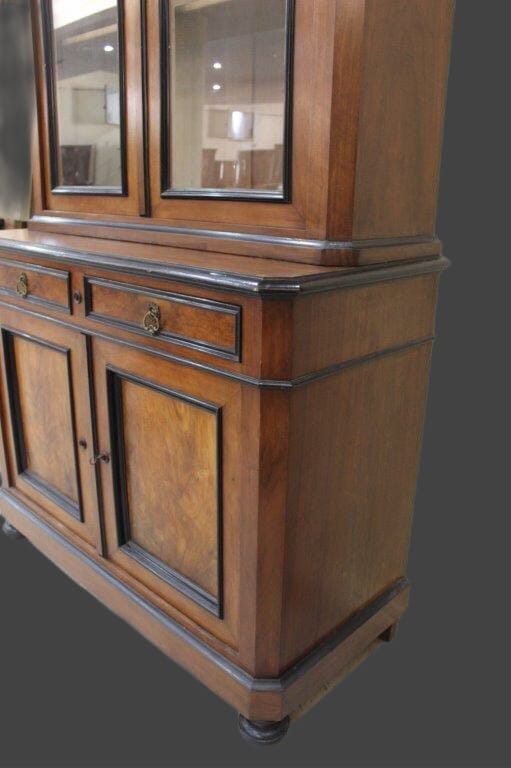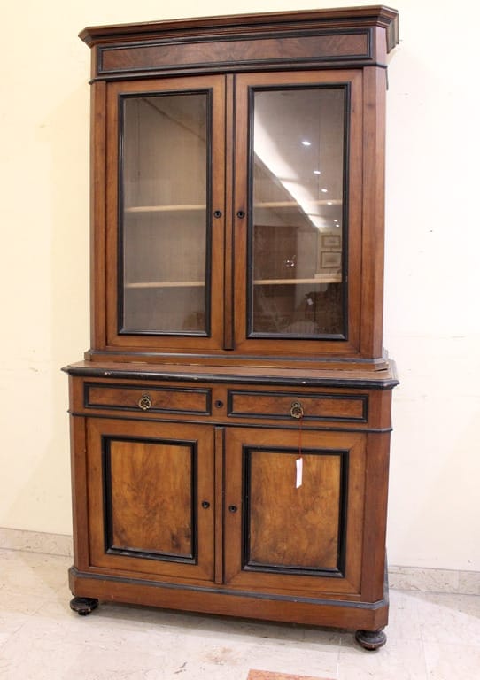 Credenza in noce e radica di noce con profili in legno tinto ad ebano.