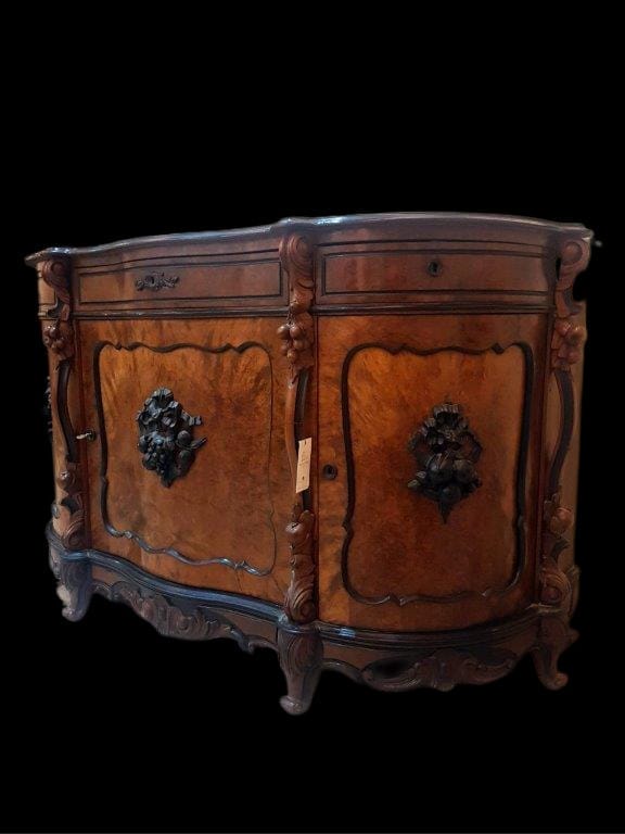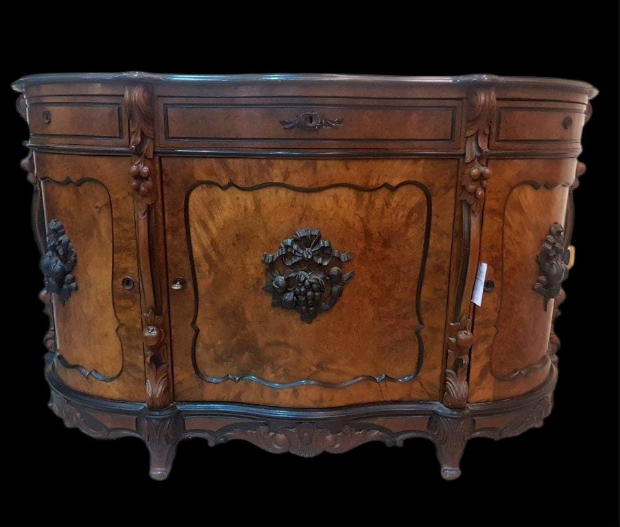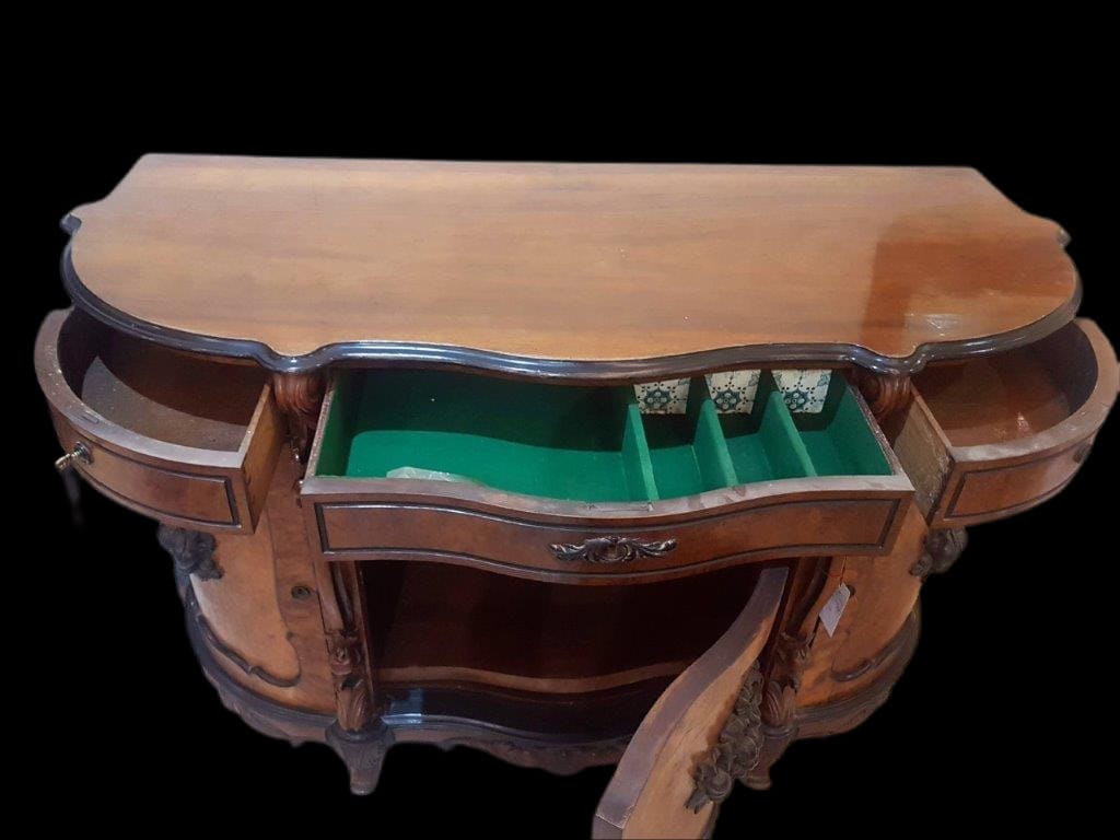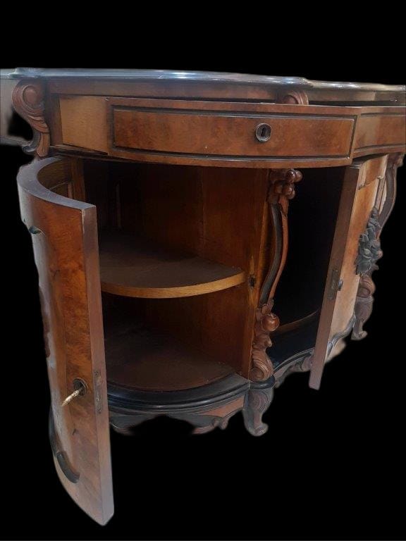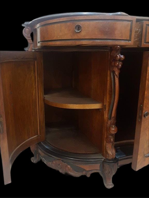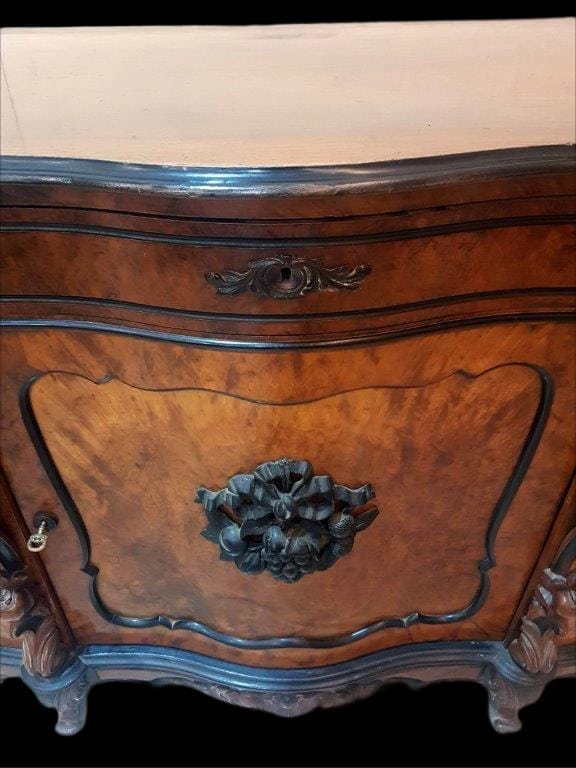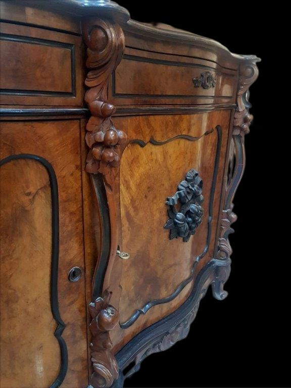 Credenza in radica di noce con decorazioni in legno ebanizzato.