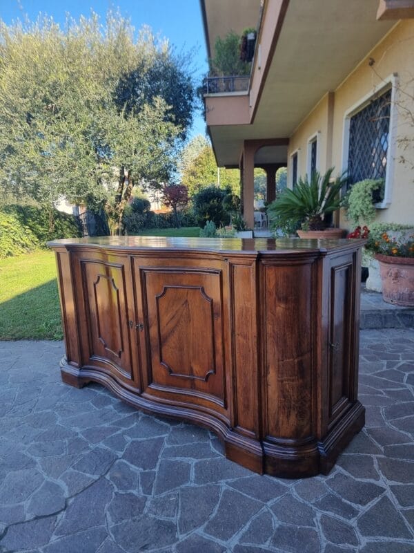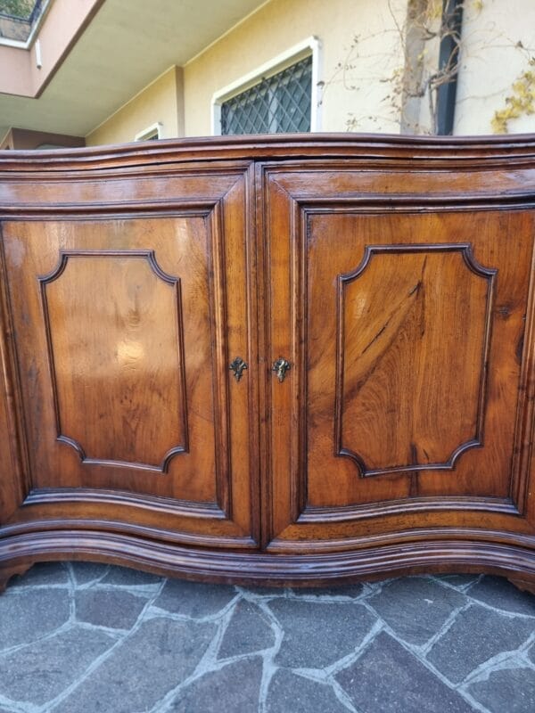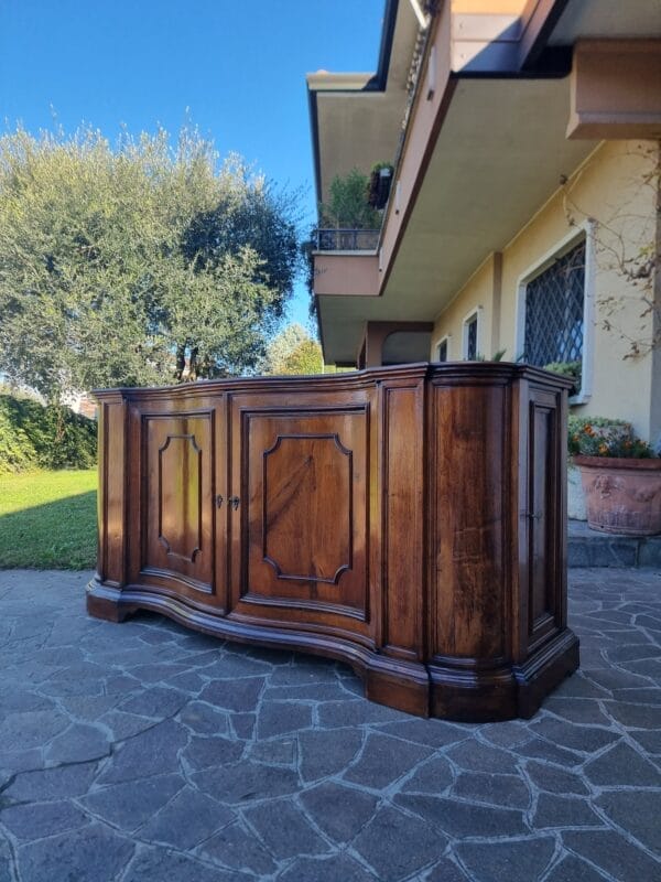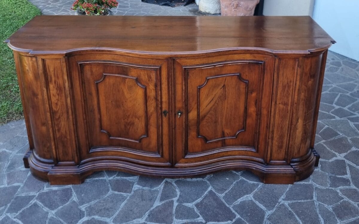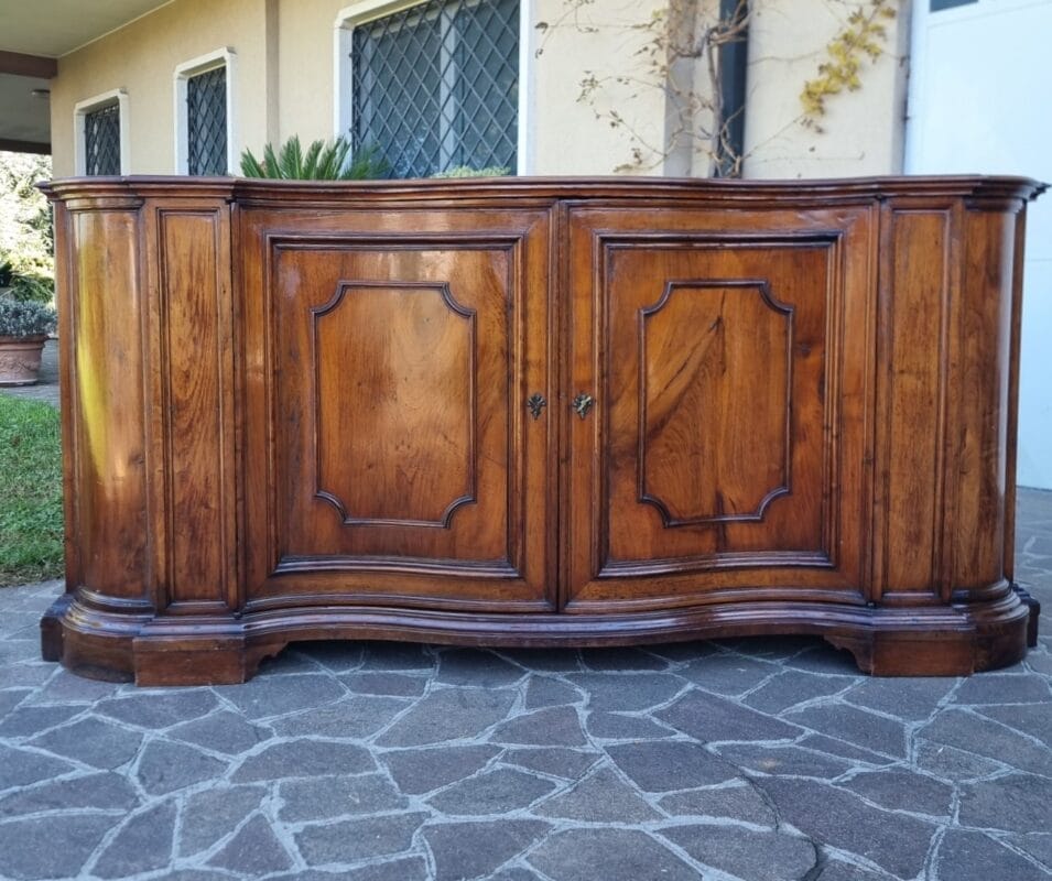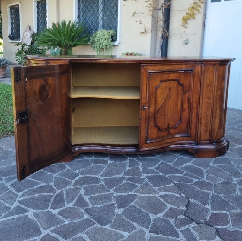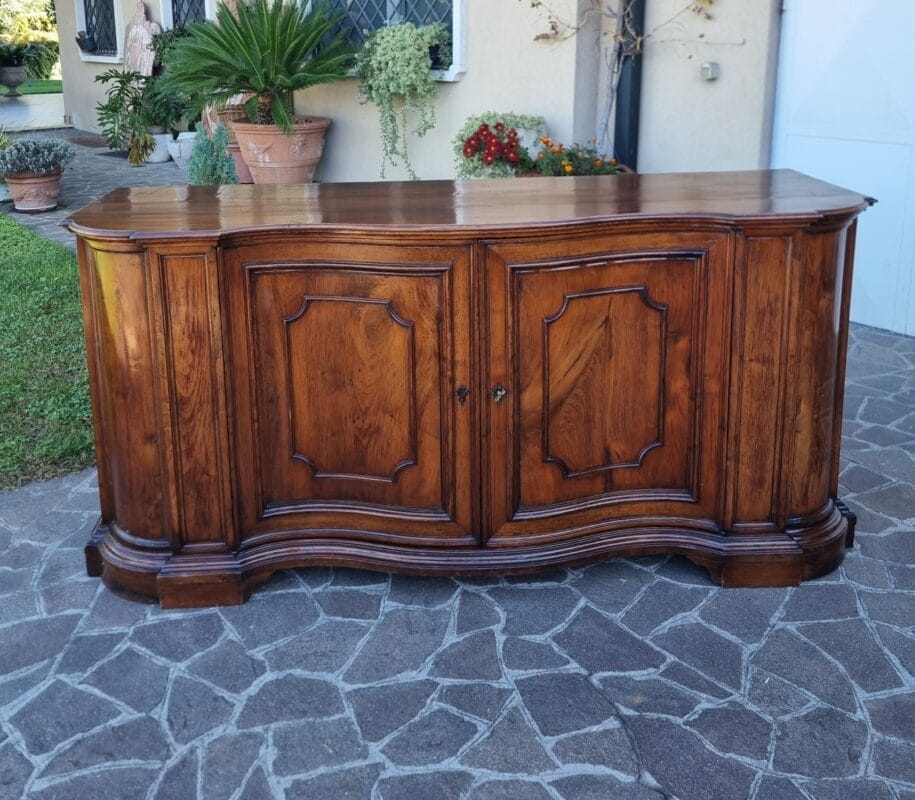 Questa importante Credenza mossa del 700 in noce Venezia rappresenta uno degli esempi più raffinati di ebanisteria veneta del XVIII secolo. In ottime condizioni generali, presenta una splendida patina, 4 porte, e misura cm 225x73xh106. Le proporzioni ampie e perfettamente equilibrate rivelano un mobile nato per abitare ambienti nobili, e, soprattutto, per comunicare autorevolezza attraverso la bellezza del legno. Il movimento “mosso” del fronte è un tratto distintivo che, tuttavia, pur essendo scenografico, rimane armonioso e mai eccessivo. Pertanto, si percepisce immediatamente la mano colta di una bottega veneziana.