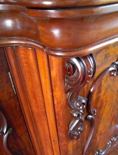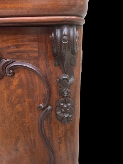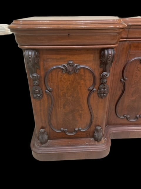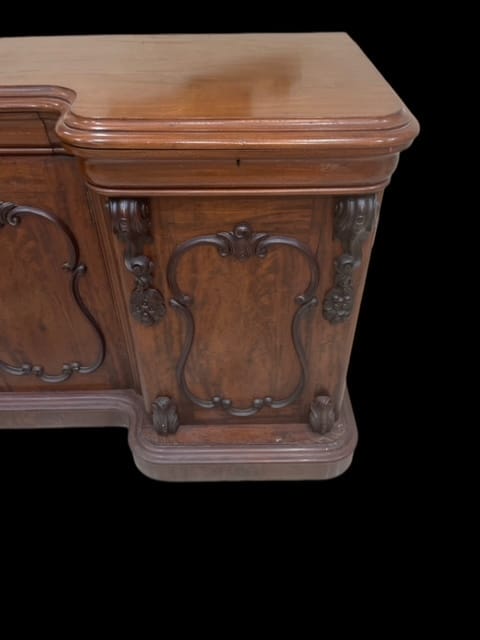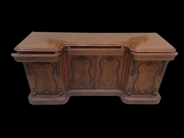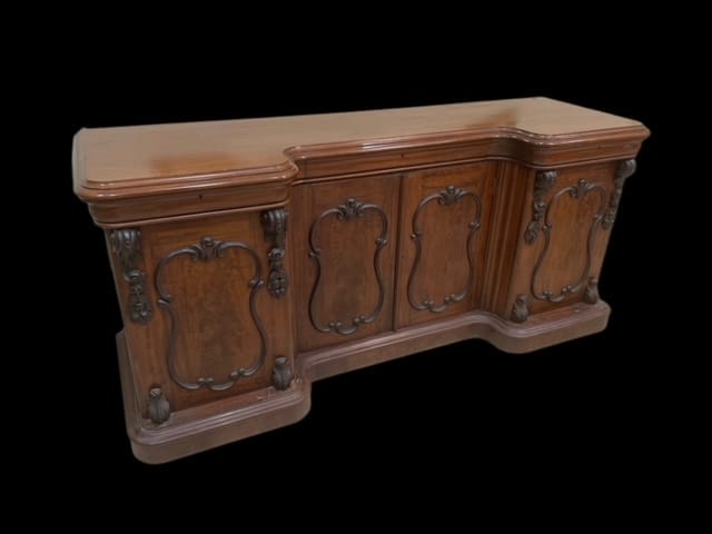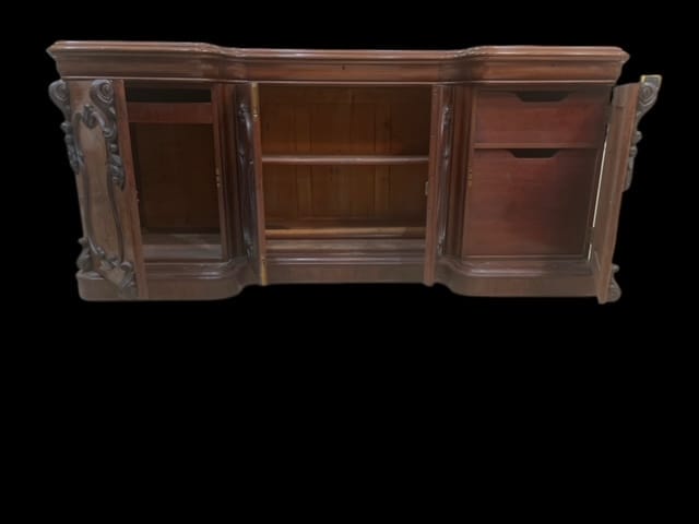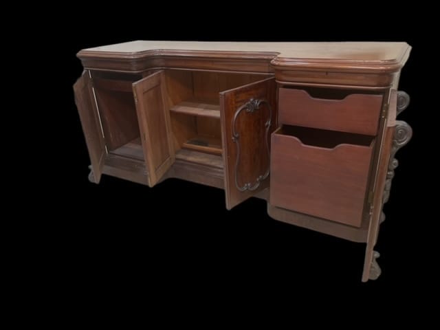 Credenza in mogano a quattro ante e tre cassetti con decorazioni in legno finemente intagliato.