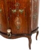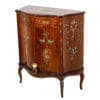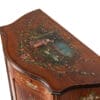 Il mobile presenta una struttura in legno pregiato finemente lucidato, con fronte sagomato e gambe slanciate a cabriole. La superficie è impreziosita da delicate pitture a mano: ghirlande floreali, nastri, pendagli e medaglioni con figure classiche, elementi tipici dell’estetica Sheraton.