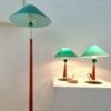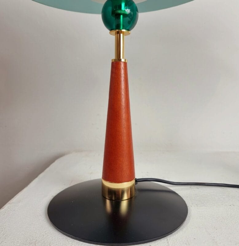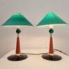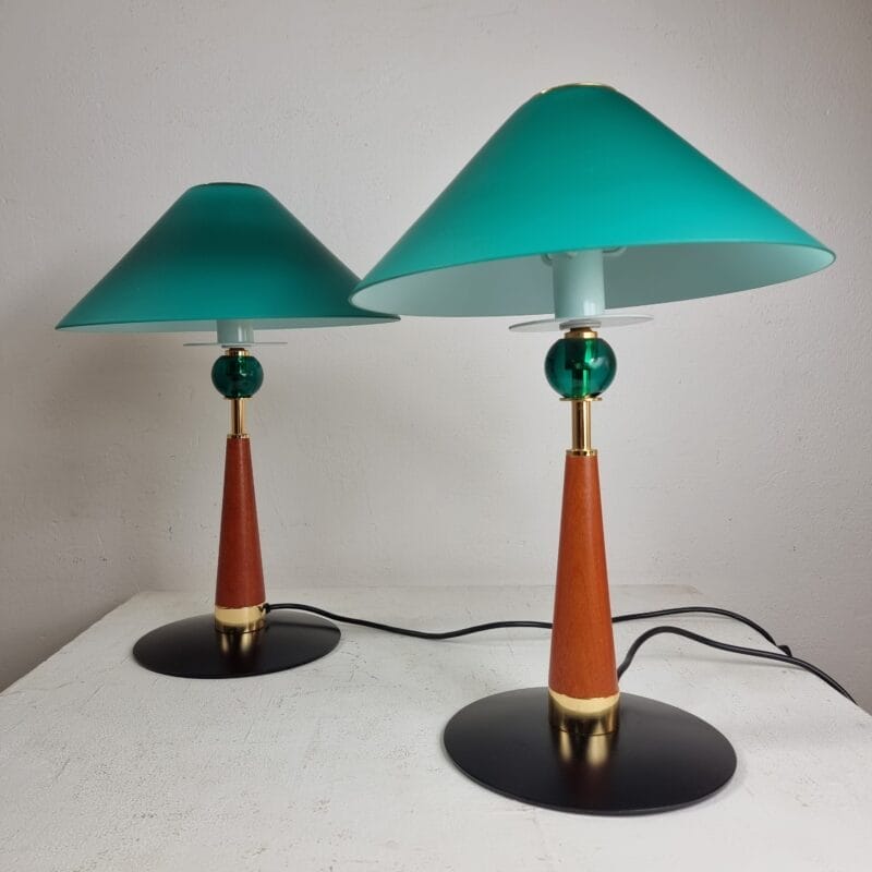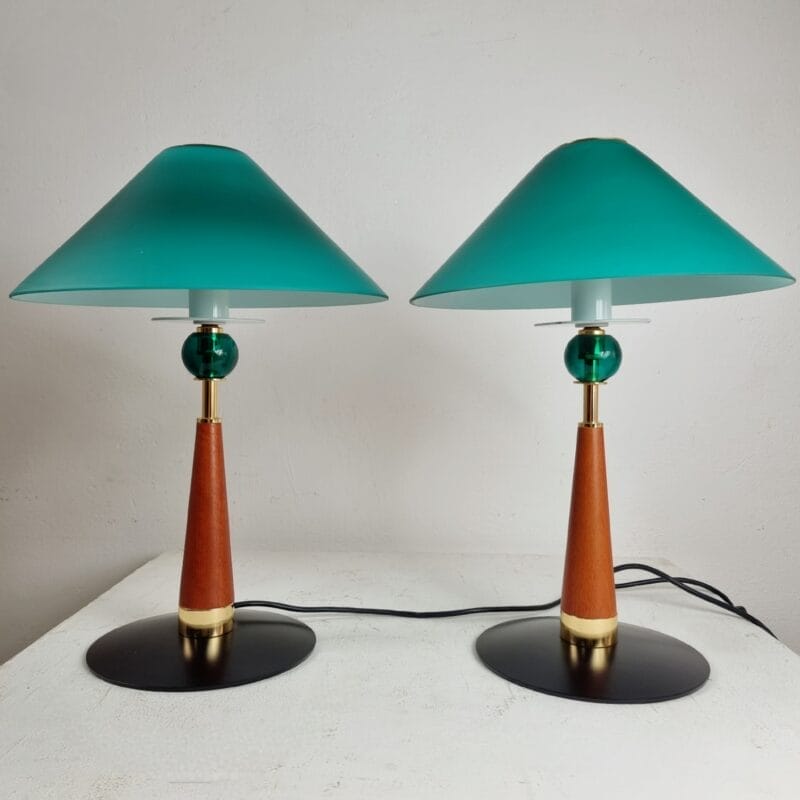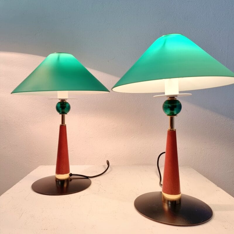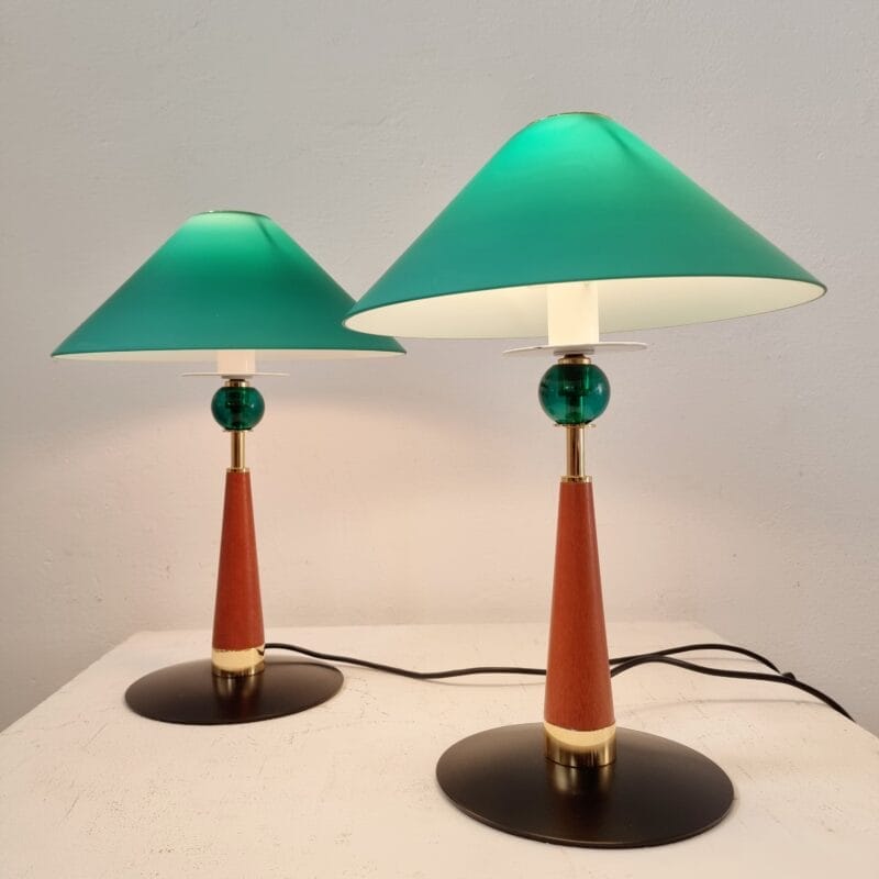 Prodotte da De Majo Murano , Fornace attiva dal 1947, proponiamo una coppia di lampade, realizzate in vetro incamiciato verde per i paralumi ,sfere in vetro soffiato color smeraldo, legno dalla bella tonalità calda, ottone e metallo laccato nero.