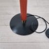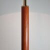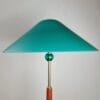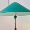 Presentiamo una rara lampada da terra, realizzata in vetro incamiciato verde nel paralume , una sfera in vetro soffiato trasparente color smeraldo, l’asta portante in legno , il portafilo in ottone mentre la base è in metallo verniciato nero.
