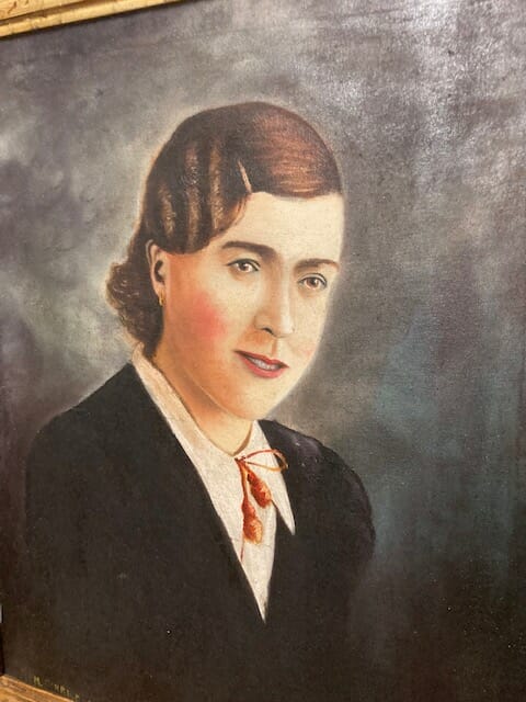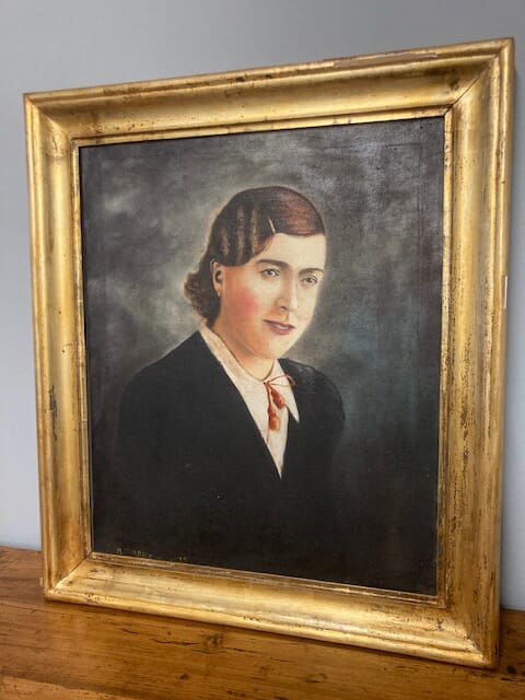 Antico dipinto olio su tela volto di ragazza datato 1939 periodo art decò in cornice dorata coeva. Ottimo stato. Pronto da appendere