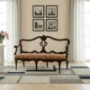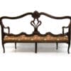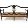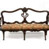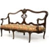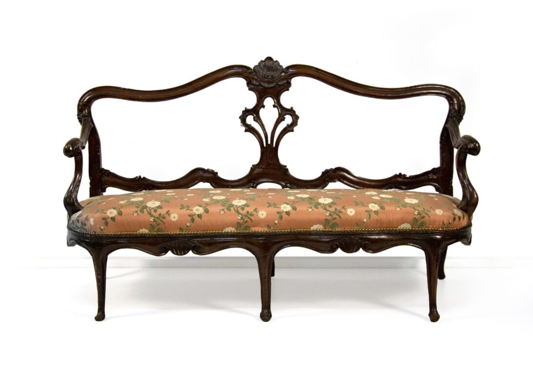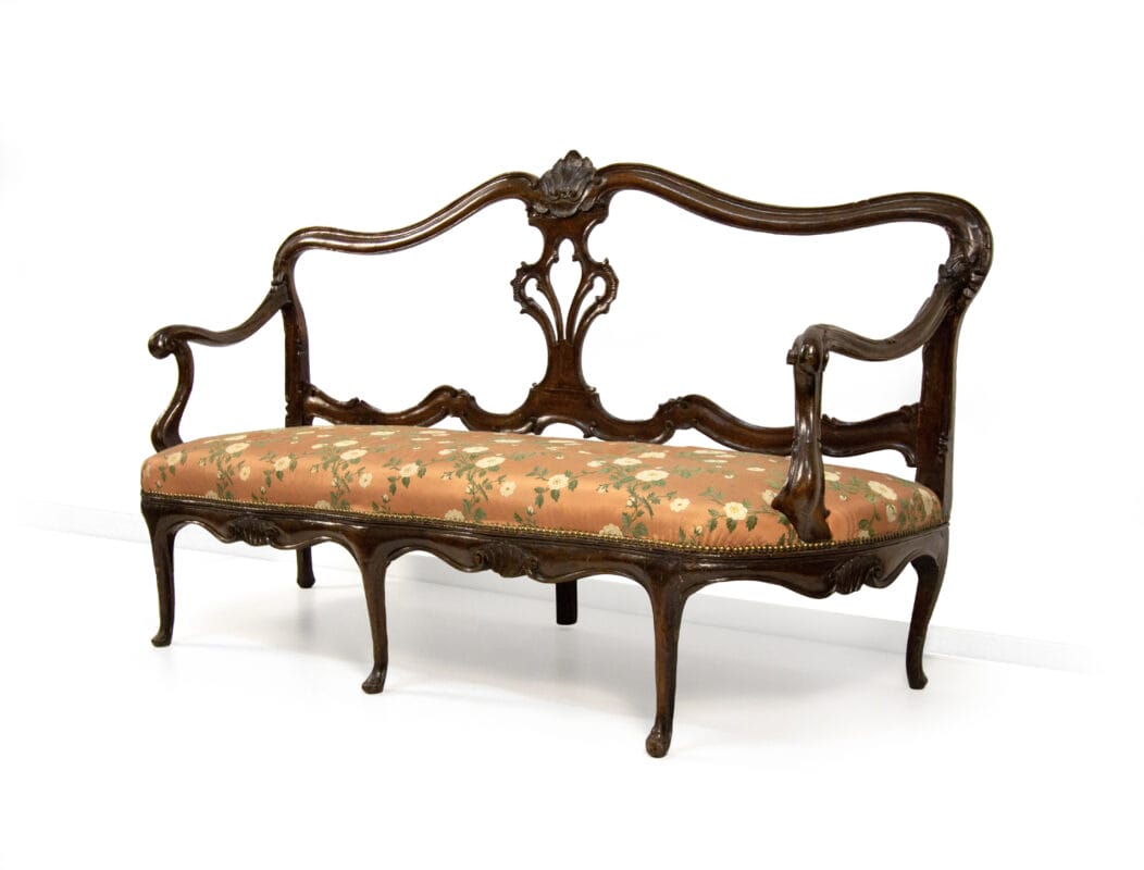 Divano in noce, Veneto, XVIII secolo, schienale a giorno a profilo sagomato centrato da una cartella intagliata; braccioli su montanti mossi, cintura a volute e gambe leggermente arcuate. Sedile imbottito e rivestito in tessuto a fiori su fondo rosa, cm 105x183x65