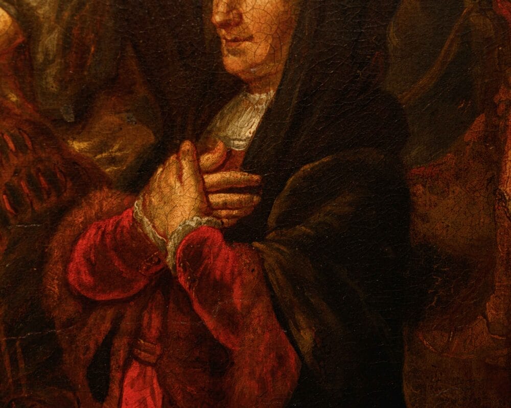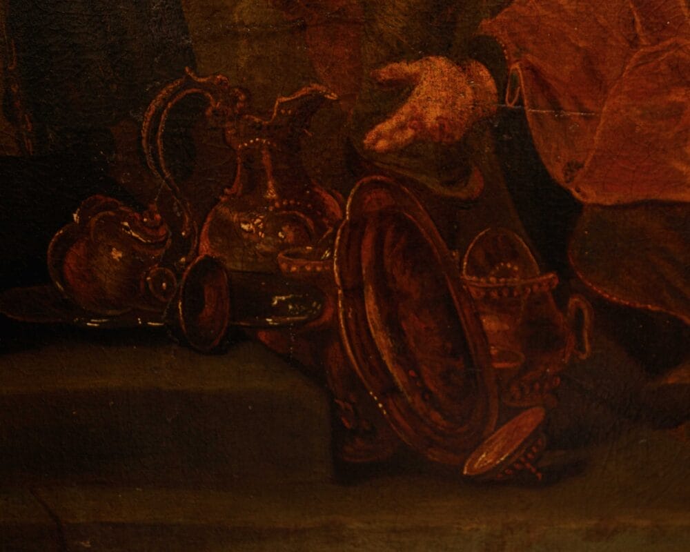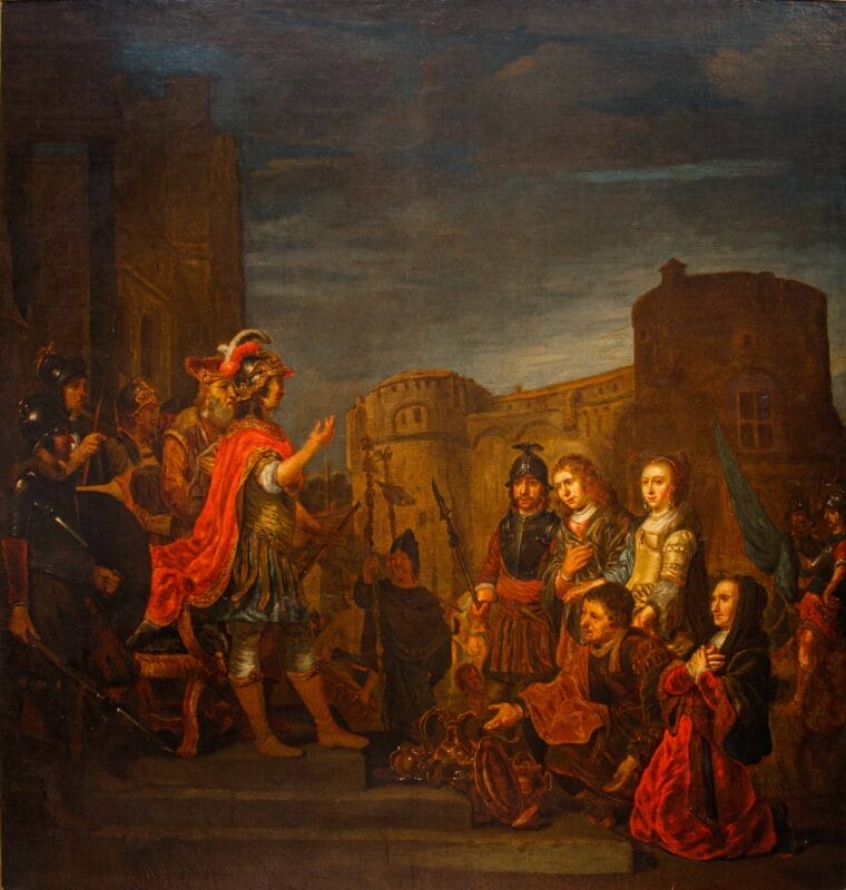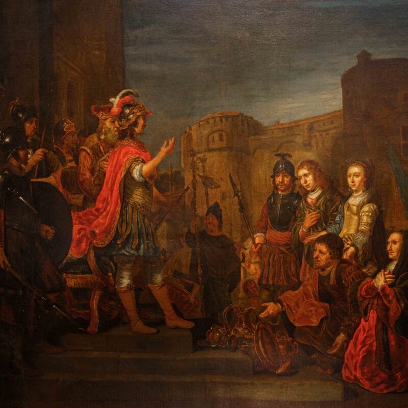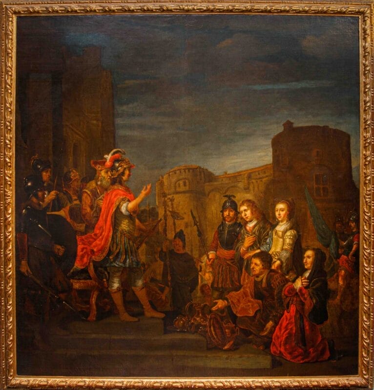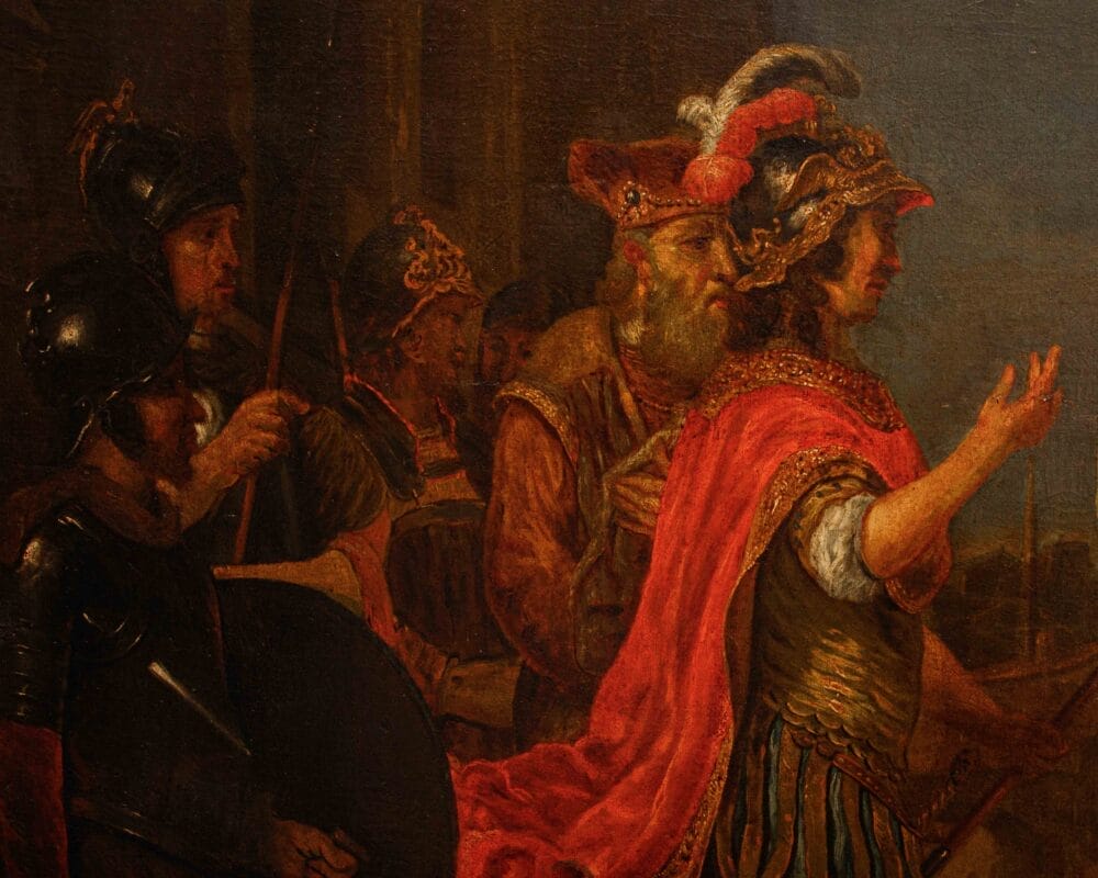 Seguace di Ferdinand Bol, Nicolaes Maes e Govert Flinck, ma sopra tutti del genio di Rembrandt, Van den Eeckhout coniugò il segno lasciato dall’arte dell’oreficeria, conosciuta nella bottega paterna, con il lessico più aggiornato della pittura fiamminga. L’inserimento entro il cosiddetto barocco olandese, di cui l’artista si fece fervido testimone in qualità del rinnovato espressionismo dei suoi dipinti storici, si accordò alla sua lezione con crescente interesse; Van den Eeckhout anticipò nell’evanescenza sottile dei preziosi oggetti ritratti, veri e propri scenari di dosate vicende umane, quanto avrebbe poi fatto Pieter de Hooch, e come questi molti altri allievi. La particolare predilezione per soggetti storici, sia biblici che di mondo, derivarono all’artista dal forte accademismo allora in voga nella città di Amsterdam, foriero di commesse internazionali che scoprirono nella controparte meridionale europea, soprattutto nella Francia, la principale richiedente sul mercato. L’accostamento a Rembrandt si consumò per Van den Eeckhout attorno agli anni Trenta del XVII secolo, permanendo tuttavia nel suo ductus pittorico, sia pure rinnovato e disciplinato in maniera spiccatamente originale attraverso la partecipata dosatura del colore. Se i toni scuri e il particolareggiato stacco luministico sono riconoscibili anche nello stile del maestro, la voce di Van den Eeckhout si disvela nel sentito lirismo che effonde dai visi dei ritratti, stigma sentimentale della vicenda narrata, capace di far pervenire allo spettatore con maggior veemenza il significato morale dell’immagine. La scena, di natura storica, si riferisce a quanto tràdito da Tito Livio (Ab Urbe Condita, XXVI, 50, 1-13 passim), successivamente romanzato dal Petrarca (Africa, IV, 375-388), tematica davvero ricercata entro il mondo della storia dell’arte. Nell’ambito della Seconda Guerra Punica, il generale Publio Cornelio Scipione (234 a.C. – 183 a.C.) cinse d’assedio e fece capitolare la città di Nuova Cartagine, in Spagna. Nell’ottica dell’offerta al nuovo conquistatore attraverso libagioni e omaggi, alcuni cittadini estesero a Scipione gran copia di argenti nonché una fanciulla, già promessa sposa di tal Allucius. Scipione ripiegò l’offerta, rendendo la fanciulla al promesso sposo. La vicenda entrò nel novero degli episodi paradigmatici del notorio altruismo romano, insieme al genuino sentimento di misericordia, poi accostato da una certa letteratura critica al rispetto cristiano, che aveva riscoperto Scipione. Il presente dipinto risulta allo stato odierno degli studi accostabile a terze repliche eseguite dallo stesso Van den Eeckhout, conservate nelle collezioni del Museo d’arte di Toledo, del Rijksmuseum di Amsterdam (1653) e del Philadelphia Museum of Art (1659); proveniente dalla Galleria Accorsi, l’opera introduce, al pari delle similari tele, ma non in riproposizione pedissequa, una precisa teoria di vasellame argenteo – che Scipione rifiuta-, esemplata sui pezzi seicenteschi eseguiti da Adam van Vianen. La linfa orgogliosamente fiamminga è offerta, nel presente, dalla vividezza dei toni dorati e rossi, che infiammano la composizione. La calibrata presentazione dei personaggi, cadenzata linearmene in primo piano, al pari delle processioni paratattiche sugli antichi fregi romani, organizza un modo ascendente dal lato destro del dipinto al sinistro, facendo così coincidere il punto di massima tensione nella persona di Scipione, eccellente vir romano, mosso dalla pietas e non già dal turpe imbarbarimento del conquistatore. Il fascio di sole che inonda le architetture sullo sfondo riverbera nel pendant lumeggiato che scorre sulle ricche vesti dei personaggi. Certo non i prossimi sposi, e nemmeno i parenti della giovane indossano vesti romano-ispaniche; la moda è quella del periodo d’oro fiammingo, magnificamente elogiata nel tripudio di morbide pieghe che disegnano il mantello di Scipione e dell’uomo inginocchiato, nonché nel purpureo velluto della donna in basso a destra. La decisa e materica pennellata, pregna di densità plastica, riempie con generosità tutte le campiture del dipinto, rincorrendo fin nel più minuto dettaglio le candide gocce di bagliore solare, che spiccano sui preziosi accatastati e sulle armature dei militi. L’intensità del brano storico, musicato attraverso splendide rifiniture artistiche, si concentra così in una monumentale istantanea politica, di vibrante apparire estatico, di vividamente felice insegnamento allegorico.