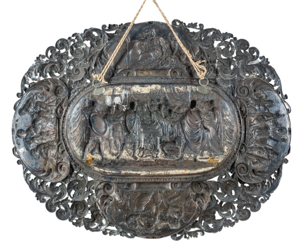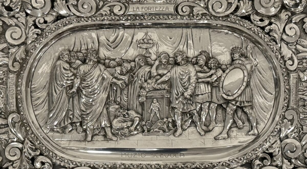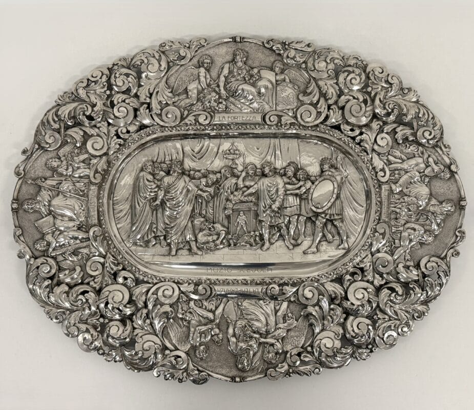 Grande piatto da parata, Milano, XX secolo, in argento sbalzato. Nel cavetto la scena principale raffigura “Il coraggio di Muzio Scevola” da Appiani, la tesa è ornata dalle allegorie delle quattro virtù cardinali, intervallate da volute di foglie d’acanto, cm 78×100; gr. 5250; punzone: Speronari 3 Milano e titolo 800