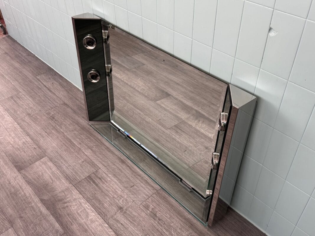 Grande Specchio illuminato da 4 punti luce in acciaio cromato su lastre di vetro grigio fumè.