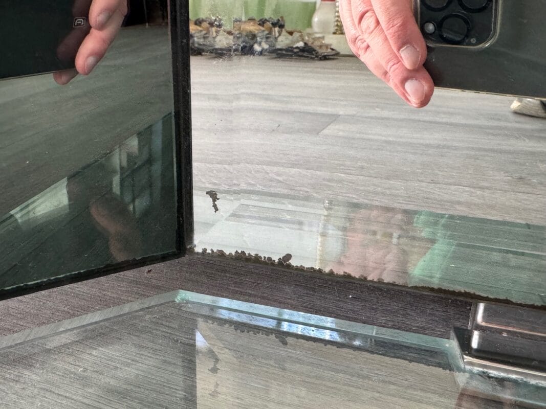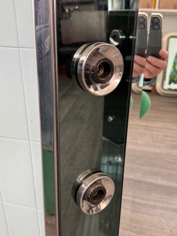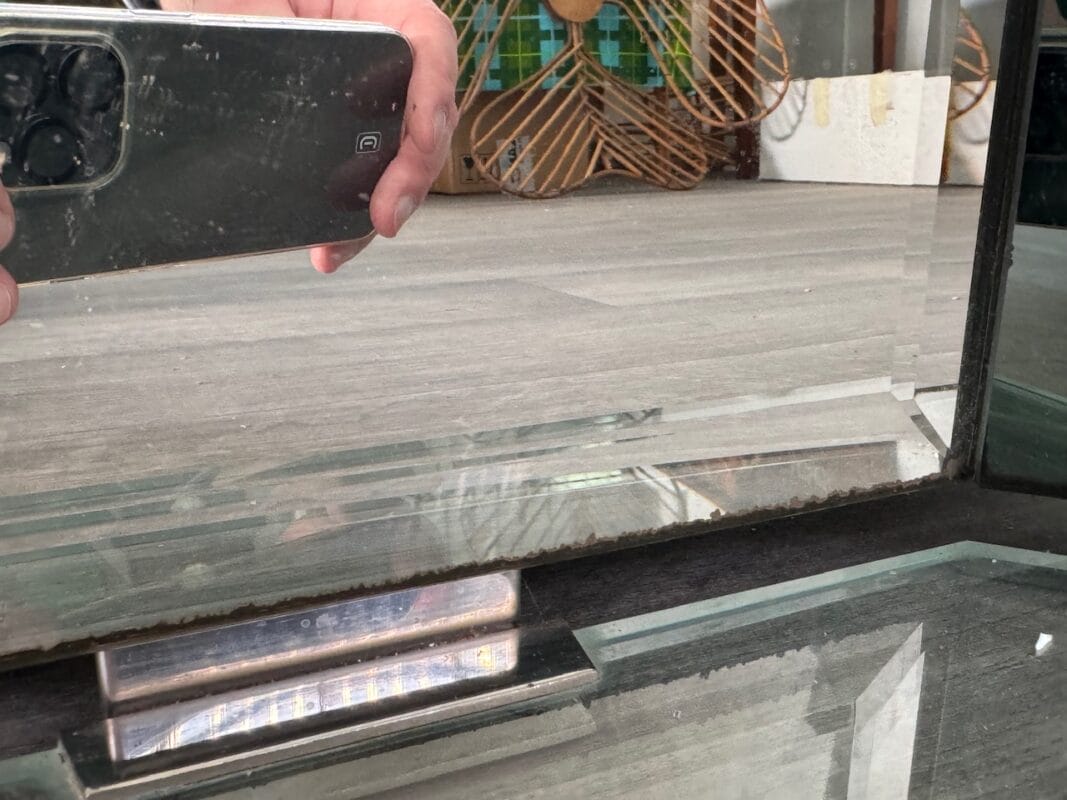 Inoltre lo specchio ha tre macchie di ossidazione sulla parte alta. Invece tutto il bordino basso ha le macchie di ossidazione interna.