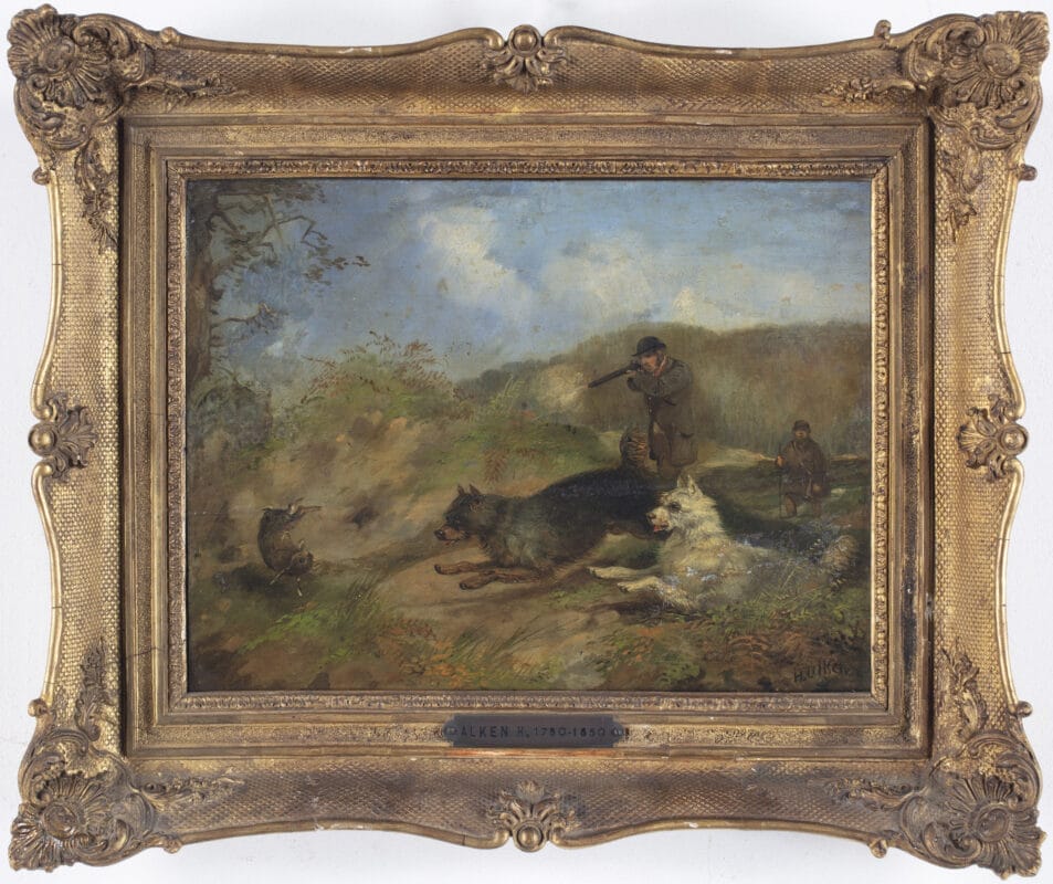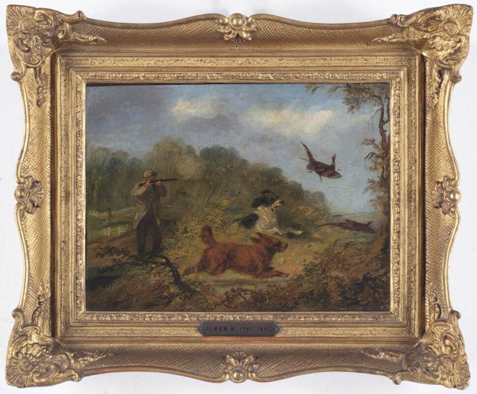 Henry Thomas Alken (1785–1851), Coppia di scene di caccia, olio su tavola, misure 20×27 cm, con cornice 32×39 cm, firmati.