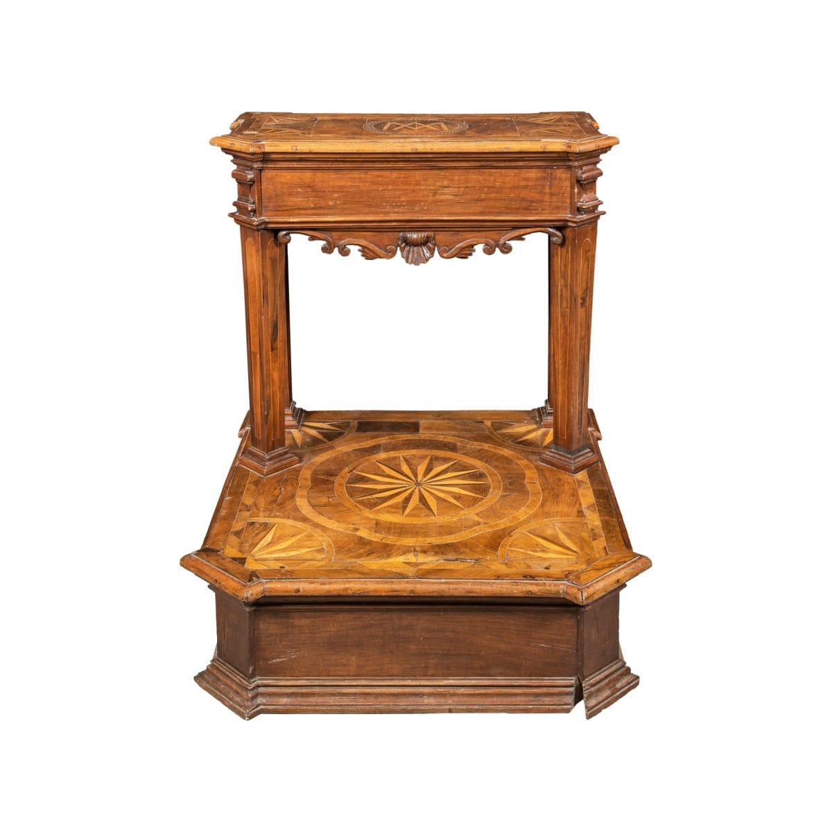 Inginocchiatoio in legno intagliato e intarsiato. Roma, XVIII secolo.