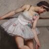 Jules Marie Auguste Leroux, autore di questa tela come indica la firma apposta in basso a sinistra, nacque nel terzo arrondissement parigino il 14 aprile 1871, durante il periodo rivoluzionario della Comune di Parigi. Figlio dell’editore di stampe Gustav Ferdinand Leroux, entrò in giovanissima età all’’École nationale supérieure des arts décoratifs, dove studiò il disegno di nudi, lavorando nel frattempo ad illustrazioni di moda e per bambini, prima di essere ufficialmente ammesso nello studio di Léon Bonnat all’’École nationale supérieure des Beaux-Arts nel 1892. Ottenne molti successi e medaglie per il disegno durante gli anni di scuola, vincendo nel 1894 il primo Grand Prix de Rome con un dipinto raffigurante Giuditta che presenta la testa di Oloferne al popolo di Betullia (oggi conservato presso la Scuola Nazionale di Belle Arti di Parigi), che gli permise di compiere tre anni di studio in Italia, a Villa Medici a Roma (1895 – 1898), accompagnato dal pittore francese Adolphe Déchenaud e dal musicista Henri Rabaud. Al suo ritorno in Francia espose nel 1898 al Salon degli artisti francesi e vinse la medaglia di bronzo all’Esposizione Universale di Parigi del 1900. In quel periodo partecipò anche alla decorazione di diversi edifici pubblici, eseguendo alcuni dei mosaici della Basilica del Sacro Cuore a Parigi con le quattro figure di San Domenico di Guzmán, San Bernardo di Clairvaux, Jean Eudes e Louis-Marie Grignion de Montfort per la cappella della Vergine. Fu professore all’École nationale superérieure des Beaux-Arts di Parigi per trent’anni, membro della giuria del comitato della Società degli Artisti francesi nel 1904, insegnante d’arte all’Académie de la Grande Chaumière e fu nominato cavaliere della Legion d’Onore. Morì a Parigi nel 1954. Leorux espose in diverse gallerie di Parigi, tra cui la galleria Allard, la galleria Georges Petit, la galleria Charpentier e la galleria Mona Lisa. Artista poliedrico e apprezzato dalla critica, Leroux ebbe un grande successo non solo come pittore, ma anche come illustratore delle opere letterarie e poetiche di Giacomo Casanova, Joris-Karl Huysmans, Honoré de Balzac, Gustave Flaubert, Stendhal, Anatole France, Jean Lombard e molti altri e come litografo, lavorando con i più grandi incisori della sua epoca come Pierre Gusman, Eugène Decisy, Raoul Serres, Florian, Jules-Léon Perrichon. Osservando il corpus della sua prolifica produzione è possibile notare un’evoluzione costante di tecniche e tematiche: le sue prime opere, infatti, erano caratterizzate da uno spiccato simbolismo e da un decorativismo tipico dell’Art Nouveau mescolati a numerosi riferimenti mitologici ed a soggetti allegorici, diversamente dalle sue opere più mature, che mostravano, invece, un rigore più classico ed una maggiore attenzione per l’anatomia femminile. È in questa seconda fase artistica che si può collocare la nostra Ballerina alla sbarra, qui presentata con un grazioso tutù in tulle bianco adornato da piccole roselline sul corpetto e sulla gonna, intenta a sistemarsi una scarpetta. Il tema della ballerina viene affrontato più volte dall’artista, vista come incarnazione della grazia, del movimento e della forza interiore. A differenza di altri artisti come Degas che dipingevano il mondo della danza con un approccio più crudo o documentaristico, Leroux tende ad idealizzarle, rendendole quasi figure mitologiche spesso raffigurate in pose classiche e con un’eleganza innata, mostrando un’armonia perfetta tra corpo e spirito. Maestro delle luci soffuse e delle ombre, attraverso cui costruisce un senso di reale tridimensionalità, abile nell’utilizzo dei colori pastello e di pennellate delicate, riesce a ricreare atmosfere sognanti ed evocatrici. La donna diventa per l’artista una musa, un soggetto da esplorare in tutte le sue sfaccettature, che sia in un contesto domestico o in un momento di intimità, rivelando una profonda sensibilità e una grande attenzione per i dettagli psicologici: sofisticati, eleganti e dotati di una forte presenza scenica, i suoi soggetti si allontanano da una visione puramente decorativa per cercare un significato più profondo, dove non vi è una mera celebrazione della bellezza, ma una vera e propria indagine della femminilità in un’epoca di grandi cambiamenti sociali.