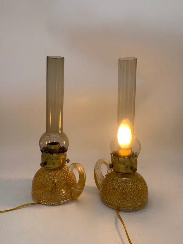 Lampade da tavolo in stile antico con base in vetro soffiato decorato color ambra/oro e manico laterale. Entrambe le lampade presentano inserti dorati con effetto murrina sommersa all’interno del vetro. La parte superiore è composta da una struttura in ottone dorato che regge un tubo di vetro trasparente fumé,