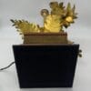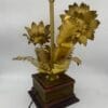 Lampada da tavolo dal design scultoreo e decorativo attribuita alla ditta Barbi, made in italy, caratterizzata da una base solida in legno con profili sagomati e rivestimento in velluto marrone, su cui si erge una composizione artistica in metallo dorato raffigurante tre grandi girasoli stilizzati. I fiori, realizzati con cura artigianale, presentano petali martellati e sagomati con bordi frastagliati e irregolari, mentre i centri sono costituiti da dischi bombati e testurizzati che imitano la superficie dei veri capolini dei girasoli. Le foglie e gli steli metallici, anch’essi dorati e leggermente ossidati, conferiscono movimento e realismo alla composizione, creando un effetto di ricca plasticità e dinamismo. Dal centro della scultura si innalza un fusto verticale scanalato, sempre dorato, che funge da supporto per il portalampada superiore. L’insieme, dal gusto vintage e art déco, unisce eleganza e teatralità, evocando la tradizione delle lampade decorative italiane.