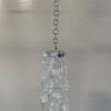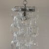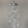 lampada a sospensione dal design raffinato e scultoreo, appesa a una catena metallica cromata che scende da un rosone conico color argento fissato al soffitto; il corpo illuminante, realizzato in una serie di elementi trasparenti intrecciati tra loro, in vetro di alta qualità, presenta forme sinuose e ricurve a U che si sovrappongono creando un effetto tridimensionale di leggerezza e movimento. Al centro, parzialmente visibile, si trova una lampadina che, una volta accesa, diffonde la luce in modo soffuso attraverso le superfici trasparenti, generando riflessi morbidi e luminosi. l’architettura moderna e il lampadario , mettono in risalto la purezza del materiale e la complessità della struttura, conferendo all’insieme un carattere elegante e contemporaneo, ma con richiami allo stile vintage dei lampadari in vetro soffiato tipici del design italiano degli anni ’70.Attribuito alla ditta Aureliano Toso