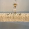 Lampadario monumentale dalla forma rettangolare con vetro cristallo trasparente composto da una fitta trama di piccoli elementi floreali in rilievo che creano una superficie elegante; Il corpo illuminante emana una luce calda e diffusa che esalta la texture dei fiorellini e conferisce un aspetto elegante e luminoso all’intera struttura.