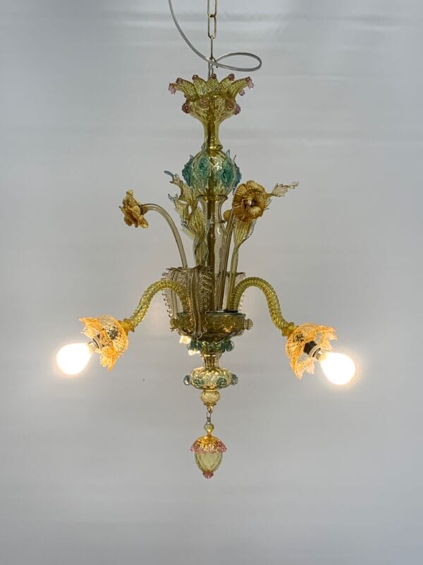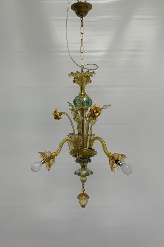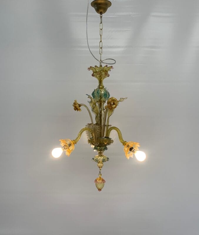 Questo lampadario in vetro di Murano  presenta una struttura sospesa tramite una catena metallica dorata collegata a un rosone a soffitto in ottone, da cui scende un cavo elettrico visibile. Il corpo centrale, finemente lavorato, mostra un’elaborata composizione di elementi decorativi soffiati e modellati a mano, caratterizzati da tonalità prevalenti  amba, verde acqua e accenti rosa. Tre bracci sinuosi e scanalati, simili a steli vegetali, si diramano dal nucleo centrale e terminano in portalampe a forma di fiori aperti, con petali traslucidi e irregolari che richiamano una lavorazione  muranese. L’estetica complessiva evoca un gusto barocco-floreale, ricco di dettagli ornamentali quali boccioli, foglie e bulbi decorativi, e culmina in un pendente finale che riprende le stesse cromie delicate, conferendo alla struttura un’eleganza artigianale sofisticata e scenografica.