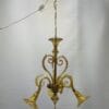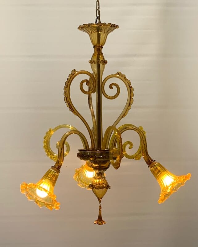 Lampadario  in vetro soffiato color ambra, caratterizzato da un design classico e armonioso che unisce leggerezza e raffinatezza artigianale. La struttura centrale, sorretta da una catena metallica dorata, si sviluppa verso il basso con un fusto slanciato e decorato da elementi curvilinei e simmetrici che si aprono in volute sinuose e arricciate, tipiche dello stile veneziano. Tre bracci arcuati si dipartono dal corpo centrale e terminano in portalampade a forma di fiore, con diffusori che ricordano campanule o gigli, dalle corolle trasparenti e bordi ondulati. Le lampadine, accese, emanano una luce calda e avvolgente che attraversa il vetro ambrato, creando riflessi dorati e un’atmosfera intima e sofisticata. I dettagli decorativi, come le piccole increspature dei bordi e gli elementi pendenti alla base, rivelano un’eccellente lavorazione manuale, rendendo il lampadario un perfetto esempio di arte vetraria muranese dal gusto classico e senza tempo.Attribuito alla ditta Venini, anni 1940