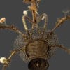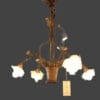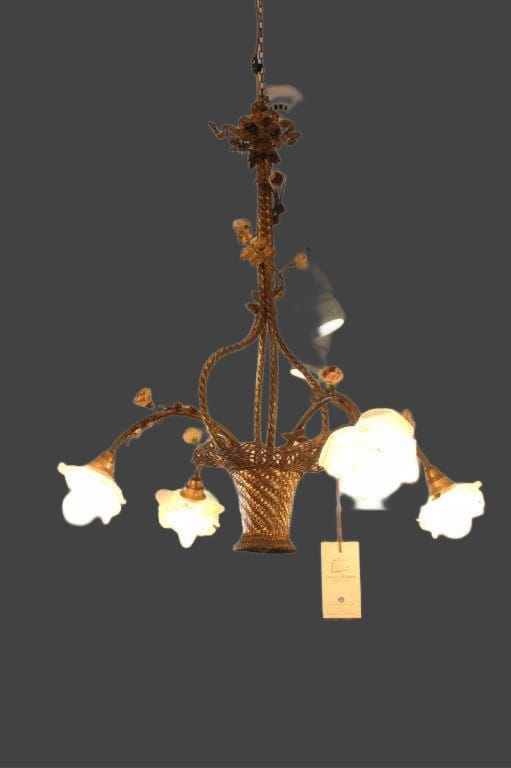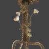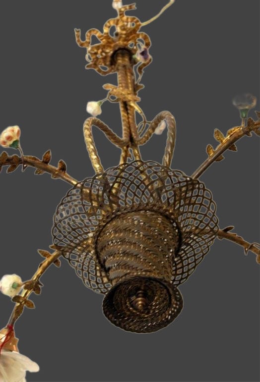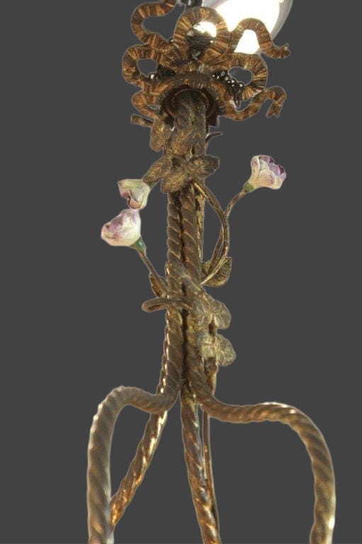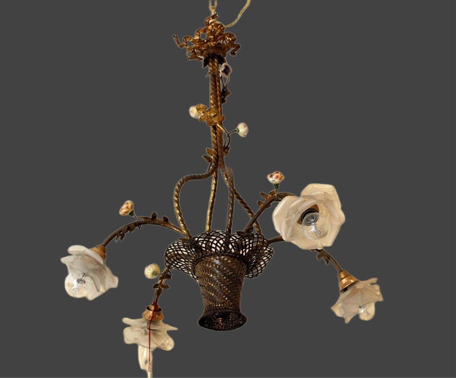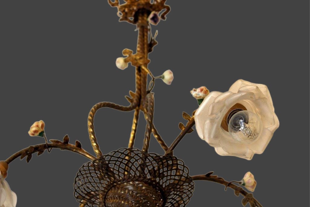 Lampadario in bronzo cesellato con decorazioni di fiori in porcellana dipinta. Quattro luci
