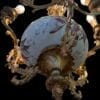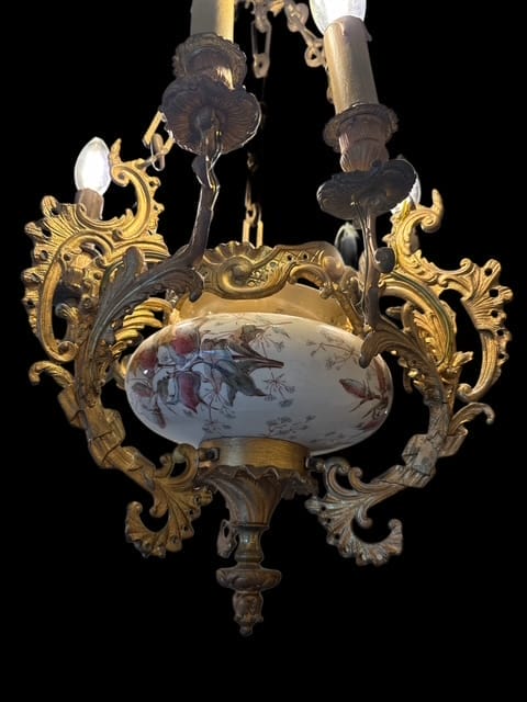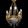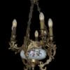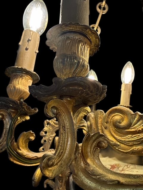 Lampadario in bronzo dorato a sei luci con parte centrale in ceramica dipinta.