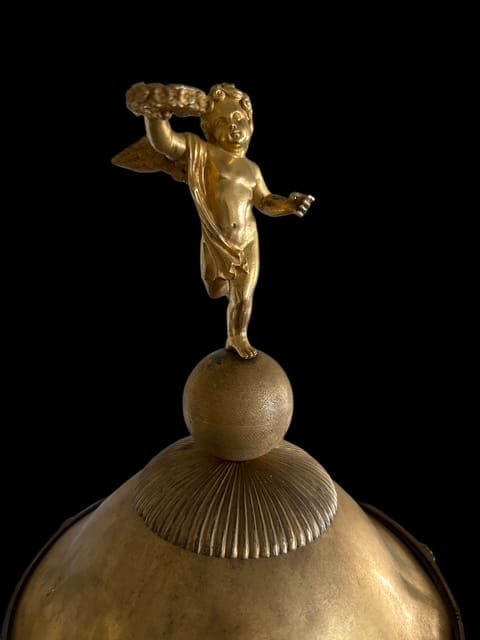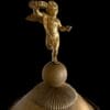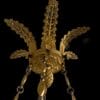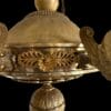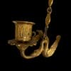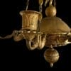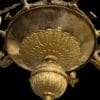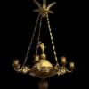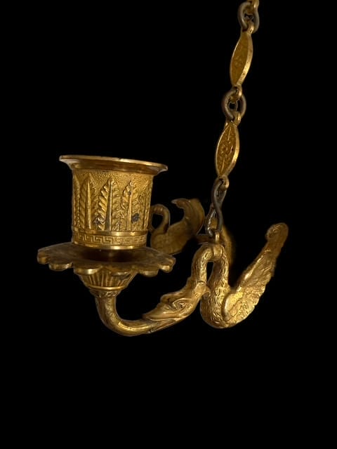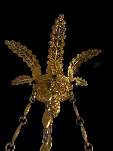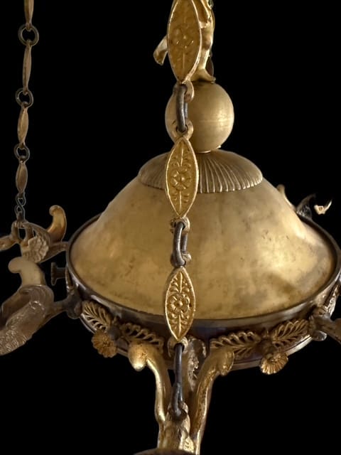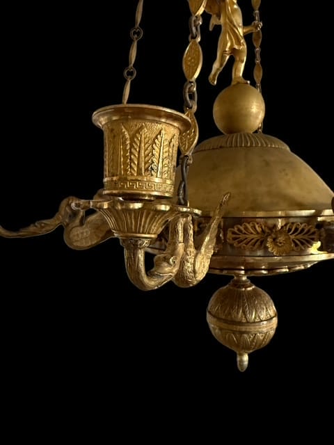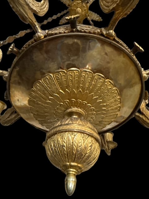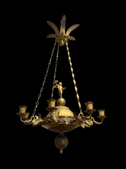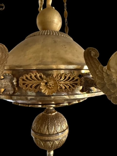 Lampadario in bronzo finemente cesellato e dorato, attacco a sei foglie da cui pendono quattro catene, elemnto centrale con la figura di cupido e otto bracci a forma di cigno.