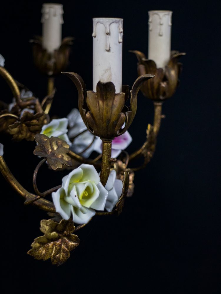 Lampadario in metallo dorato lavorato a motivo floreale con roselline in porcellana dipinte . Il lampadario, di dimensione cm 70 di altezza e diametro cm 75, è appeso al soffitto con catena originale che consente una lunghezza di sospensione massima di circa 150 cm. Impianto a otto luci completamente funzionante. Peso complessivo kg 6