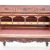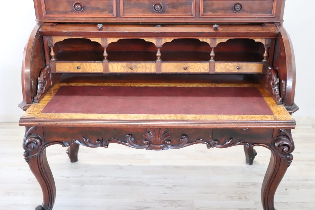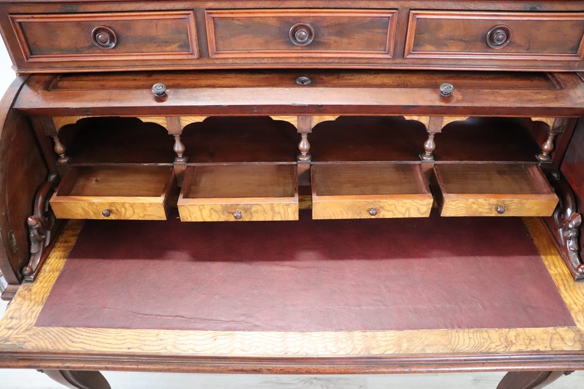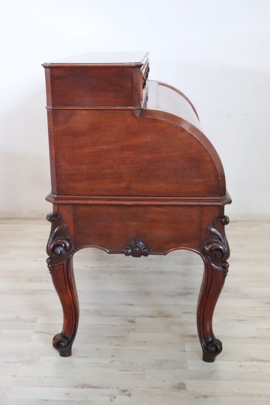 Vi presentiamo questa maestosa scrivania italiana del XIX secolo. Una scrivania estremamente particolare che può essere discreta e utilizzata in diversi ambienti grazie al suo design unico. Lo scrittoio è realizzato in pregiato legno di mogano, la sua linea è bombata e fluida, con gambe mosse e finemente intagliate con decorazioni a ricciolo e a volute che donano un fantastico effetto di leggerezza. La sua caratteristica più particolare è il piano di scrittura che si scopre solo quando si apre la parte bombata anteriore con un semplice meccanismo a rullo. Quando il piano è aperto si ha a disposizione un pratico ed elegante supporto per la scrittura o la consultazione di documenti, comprensivo di quattro cassettini interni ideali per piccoli oggetti. Sul fronte sono presenti altri sei cassetti per riporre i piccoli oggetti di uso quotidiano. Considerate che la scrivania è stata progettata per essere posizionata anche al centro della stanza, quindi avrete una grande versatilità nella scelta del suo posizionamento. Questa maestosa scrivania può essere utilizzata in qualsiasi stanza della casa, il suo design unico sarà ammirato da tutti i vostri ospiti. Potete certamente pensare di collocare questa preziosa scrivania in salotto, in camera da letto o in qualsiasi stanza della casa in cui sia necessario svolgere un lavoro d’ufficio, senza rinunciare all’eleganza dell’ambiente.